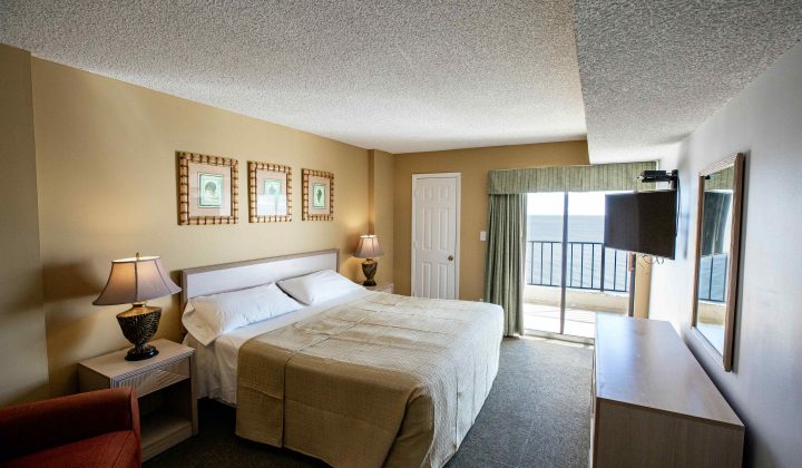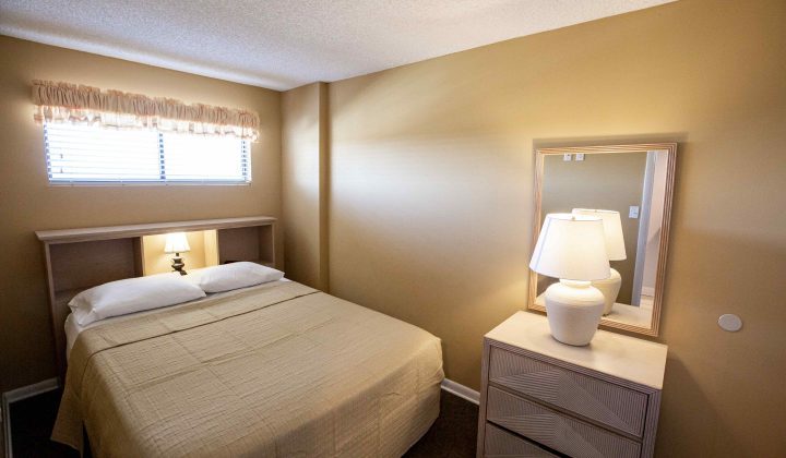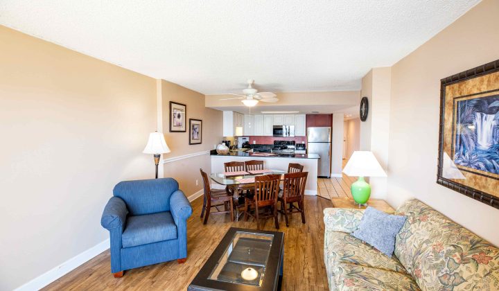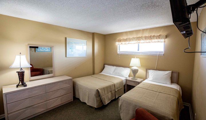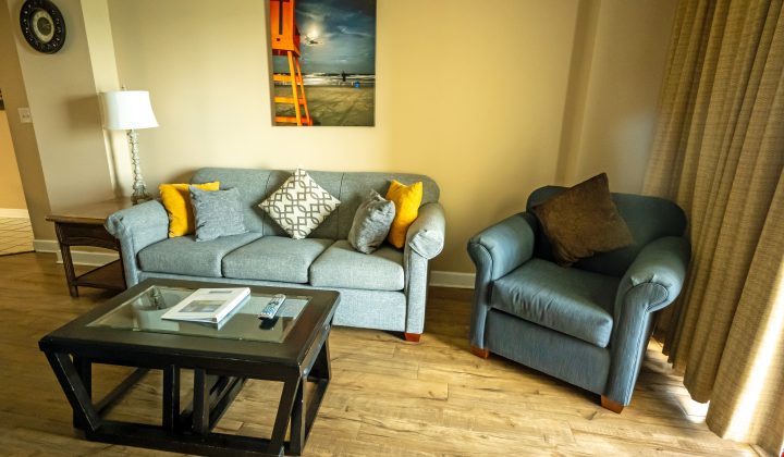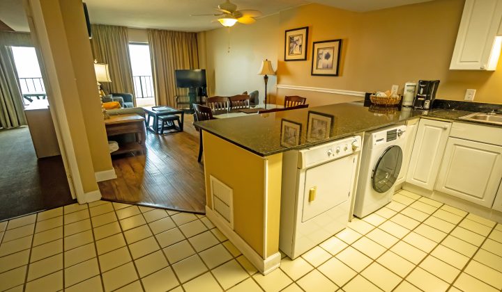 Our three-bedroom suites come furnished with a king-sized bed in the master bedroom, a queen-sized bed in the second bedroom, a twin-sized and full-sized bed in the third bedroom, and a full-sized sleeper sofa in the living room. There is plenty of space to sleep 8 people comfortably, and plenty of room amenities, such as a washer and dryer, to make your stay as easy as possible. Also enjoy beautiful ocean views from your unit’s private balcony.
