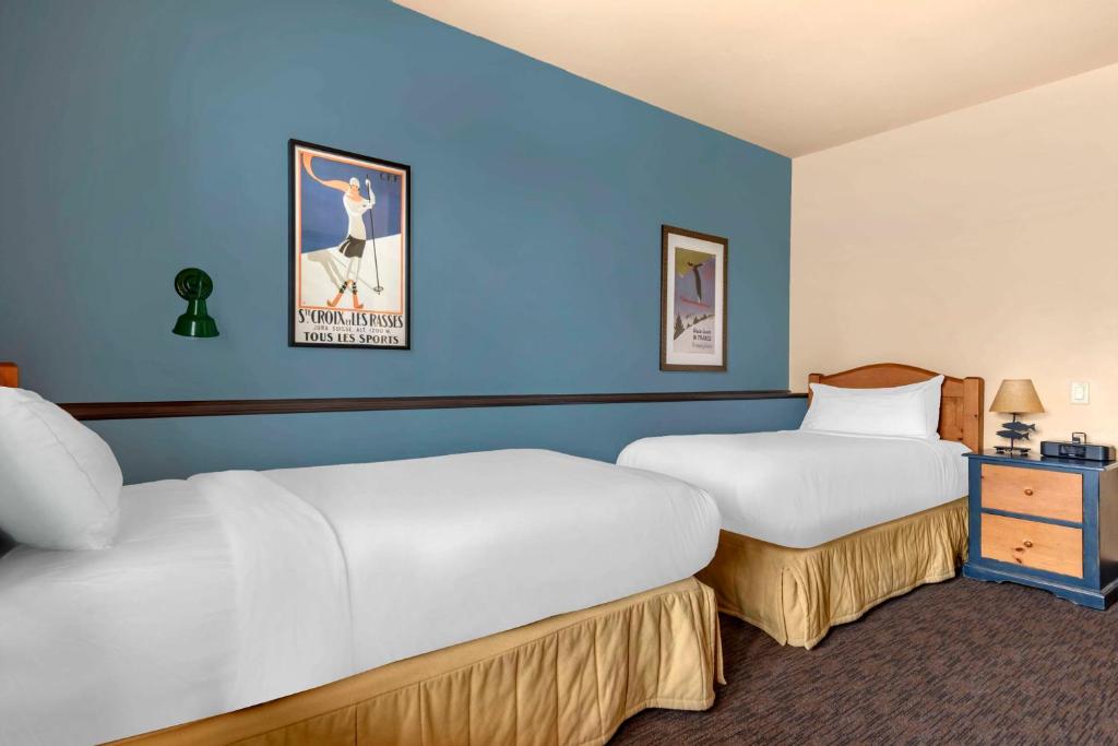 Each 2-Bedroom Suite includes a primary bedroom with a king-size bed and a primary bathroom with a walk-in shower and a separate large soaker tub. The Guest bedroom is furnished with two twin beds. The second full bathroom features a shower/tub combination. The living room is furnished with a queen sleeper sofa, a TV with a Blu-ray player and a gas fireplace. The fully equipped kitchen features a refrigerator, stovetop, oven, dishwasher and cooking utensils for in-room dining. Each 2-Bedroom Suite features a private deck area with seating and seasonal hammocks. For 2-Bedroom corner Suites, Guests can enjoy a 4-person hot tub and a barbecue grill on the private deck.