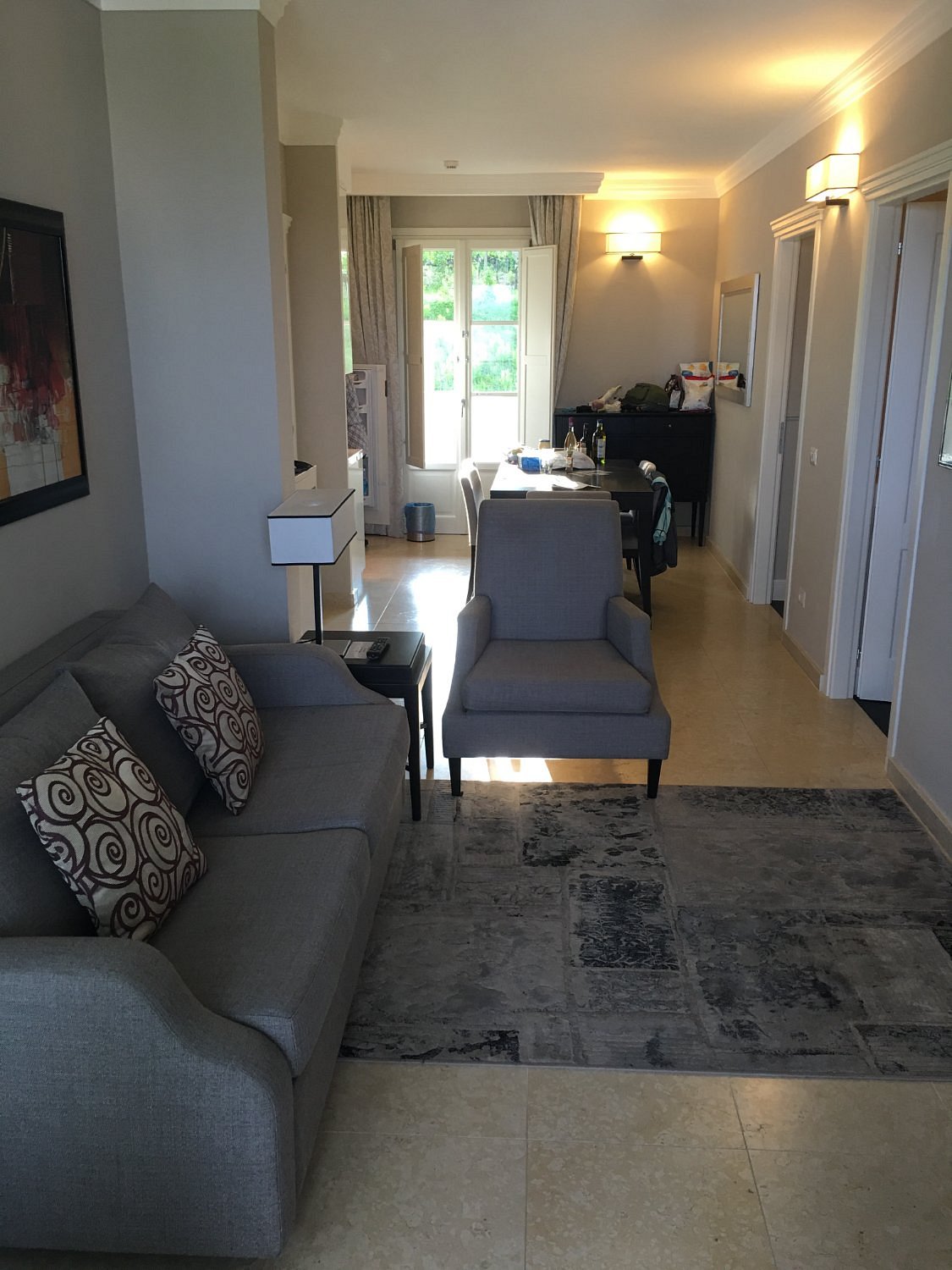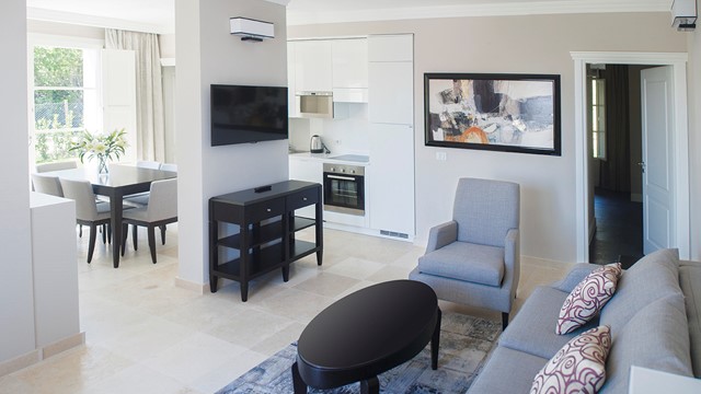 This one-bedroom, one-bathroom suite with an outside terrace features a primary bedroom with king-size bed and bathroom with a standing shower. An elegant living room with dining area, and a sleeper sofa, as well as a full kitchen and washer/dryer combo.