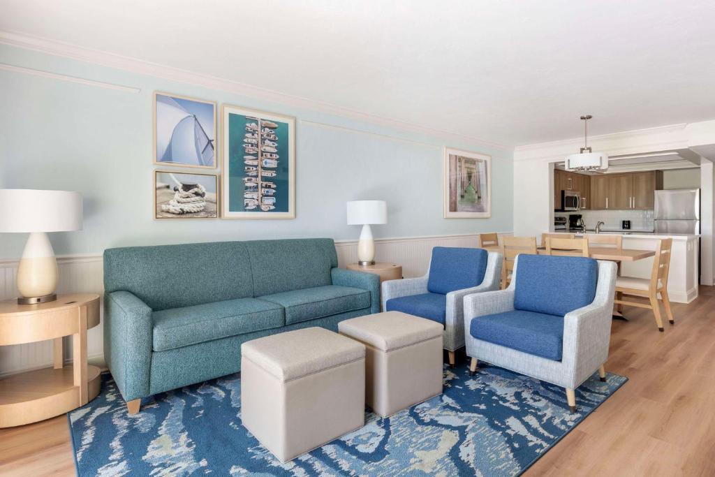 2-Bedroom Suites feature a king-size bed in the primary bedroom, two twin-size beds in the second bedroom, a sleeper sofa in the living area, a screened balcony and a fully equipped kitchen. The kitchen features a refrigerator, coffee maker, oven with stovetop, microwave and toaster. All Suites also have in-room washers and dryers.