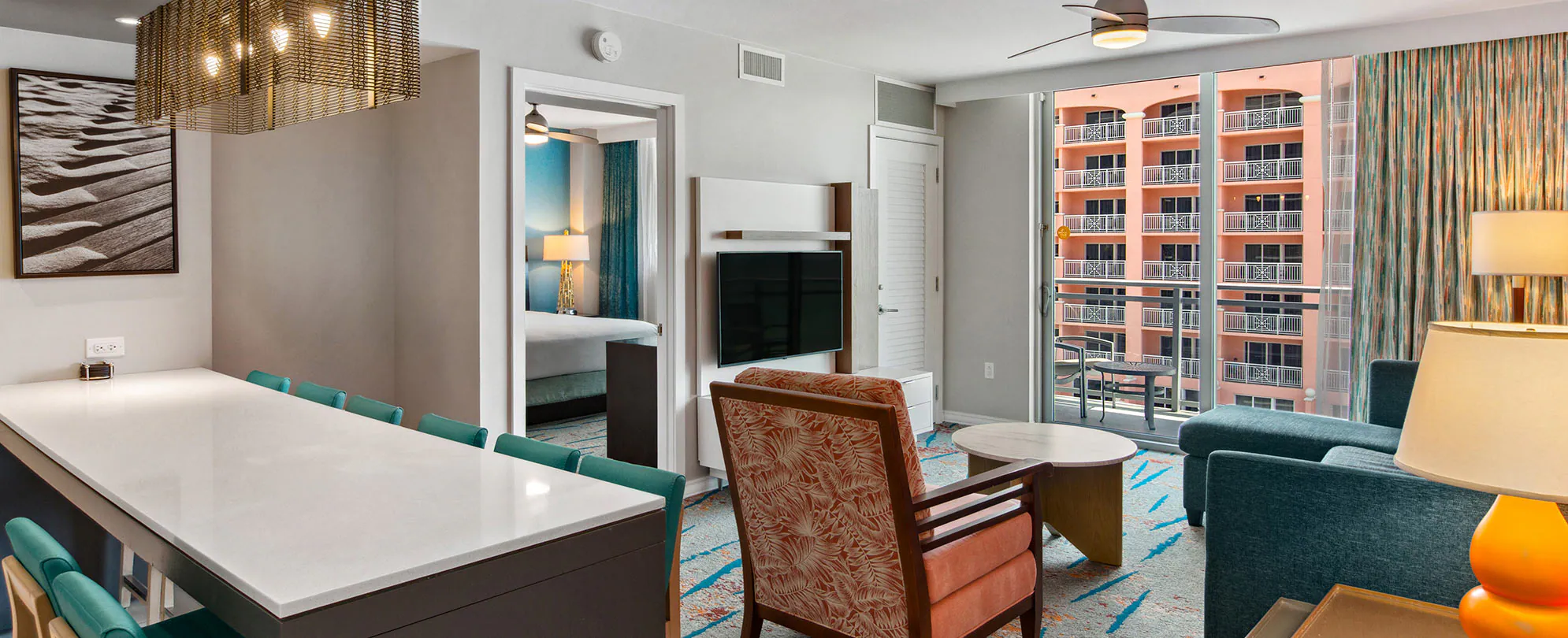 This spacious suite offers approximately 1,120 sq. ft. of comfortable living space and can accommodate up to 8 guests. It features a full kitchen, 1.75 bathrooms, and flexible sleeping arrangements ideal for families or groups.