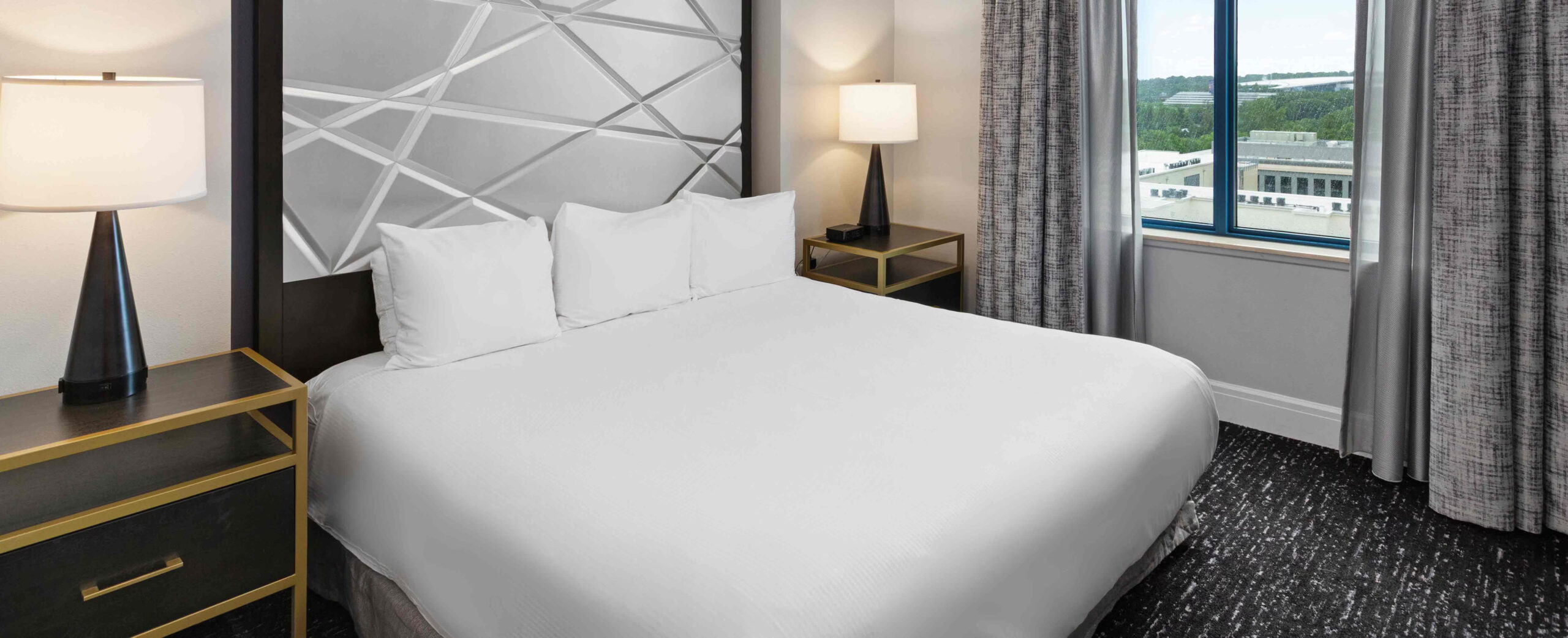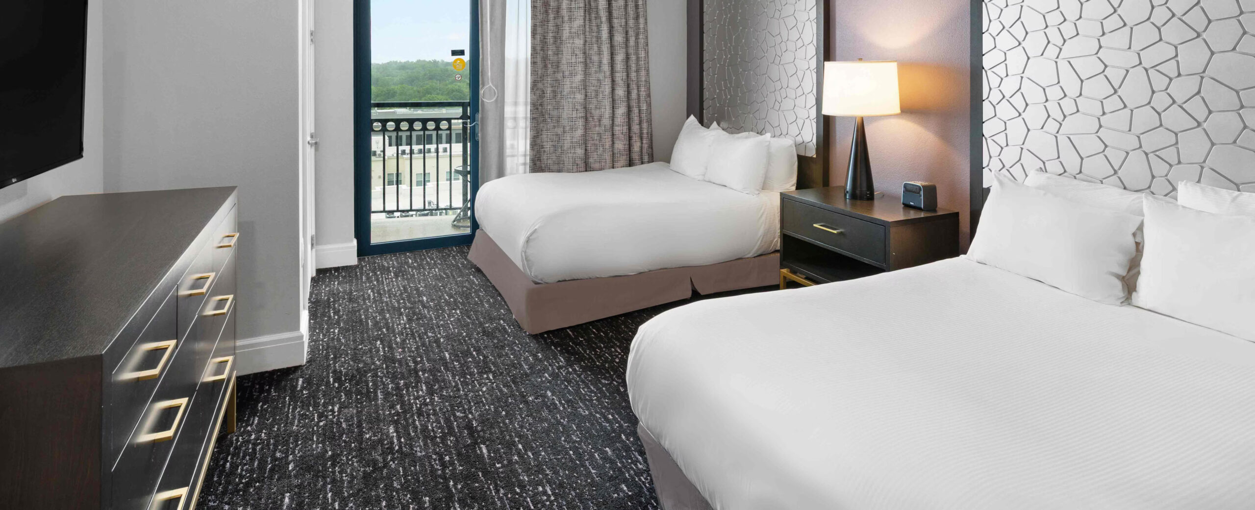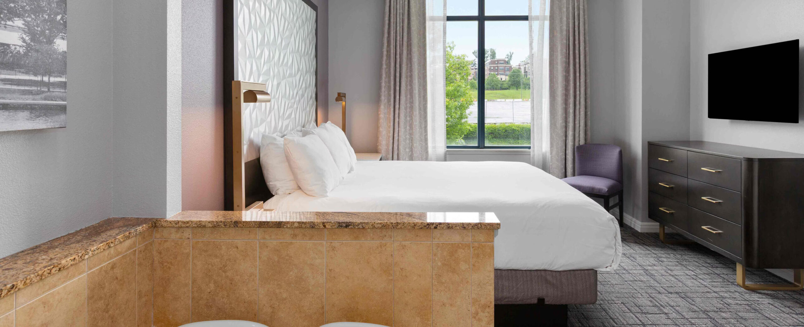 This expansive suite offers 1,296 sq. ft. of thoughtfully designed living space, making it ideal for large families or group stays. The suite features a full kitchen and two bathrooms, providing comfort and convenience for up to ten guests. Sleeping arrangements include two king beds, two double beds, and a queen sleeper sofa, ensuring flexible and comfortable accommodation. A jetted tub adds a relaxing touch, while modern entertainment and in-room amenities enhance the overall stay experience.