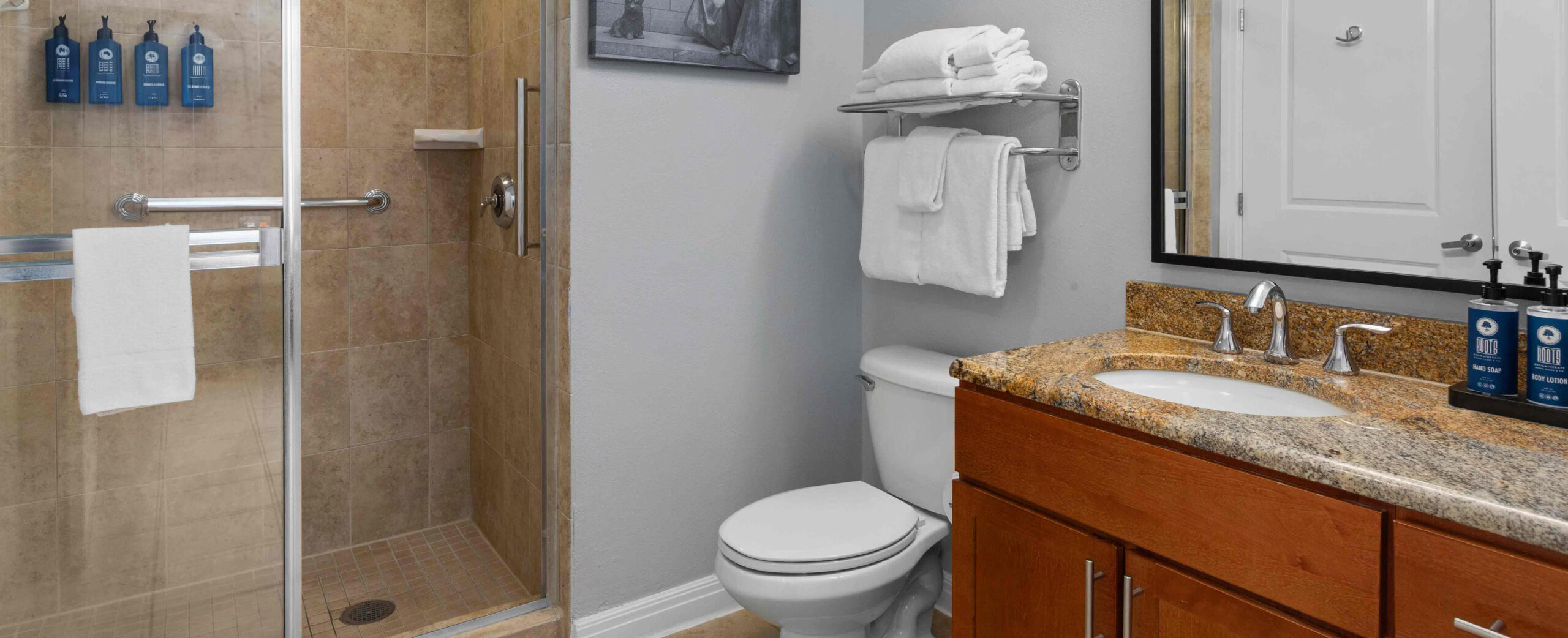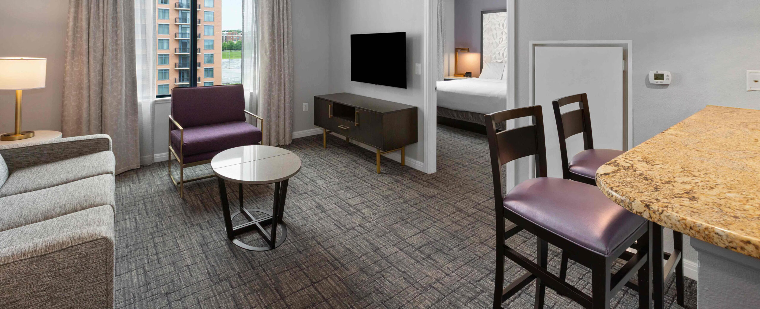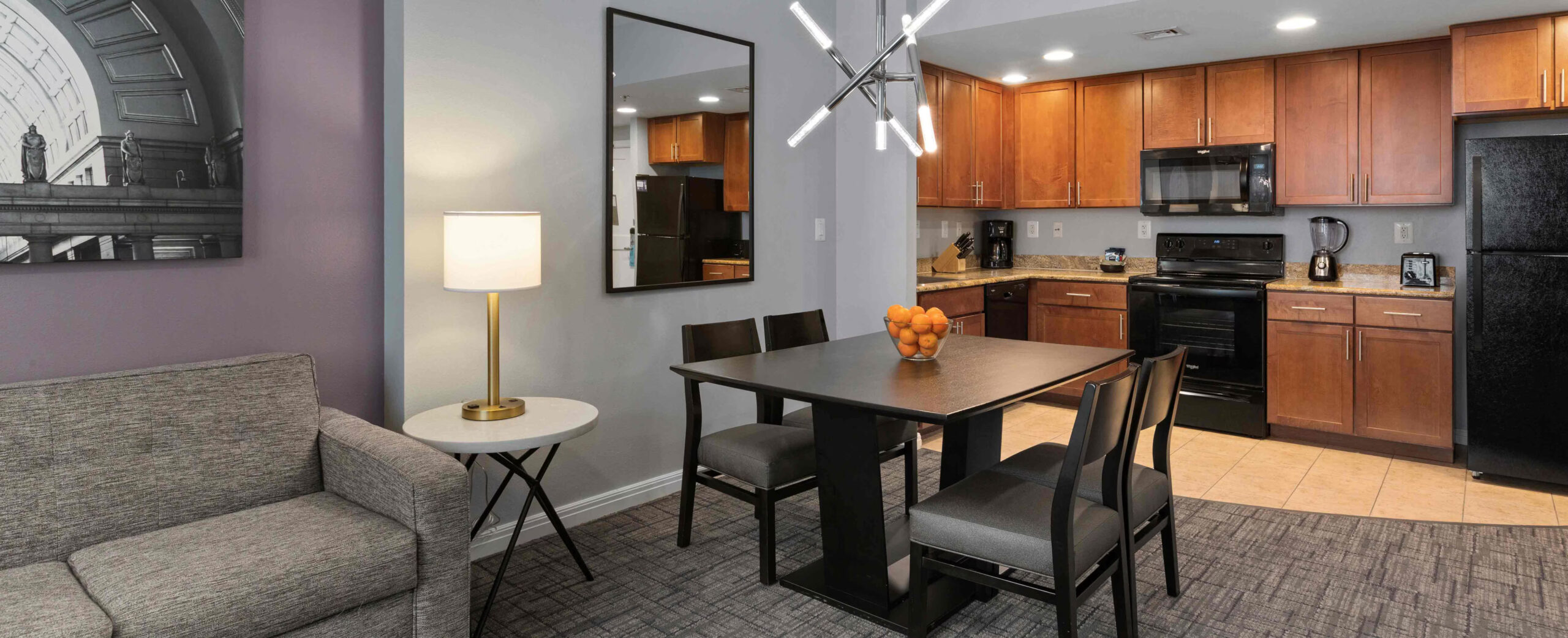 This expansive suite offers 1,296 sq. ft. of thoughtfully designed living space, making it ideal for large families or group stays. The suite features a full kitchen and two bathrooms, providing comfort and convenience for up to ten guests. Sleeping arrangements include two king beds, two double beds, and a queen sleeper sofa, ensuring flexible and comfortable accommodation. A jetted tub adds a relaxing touch, while modern entertainment and in-room amenities enhance the overall stay experience.