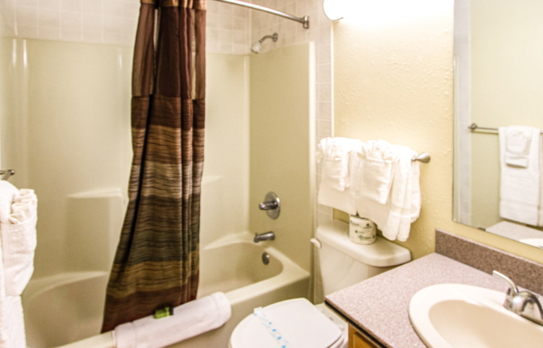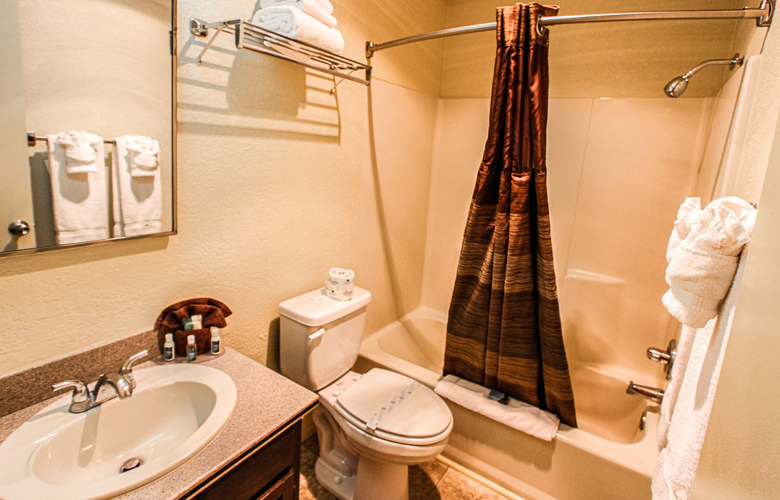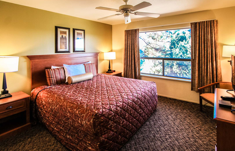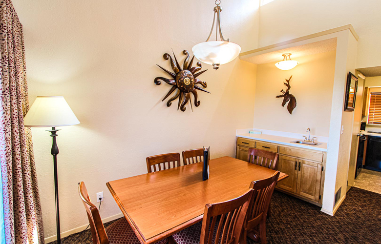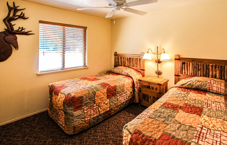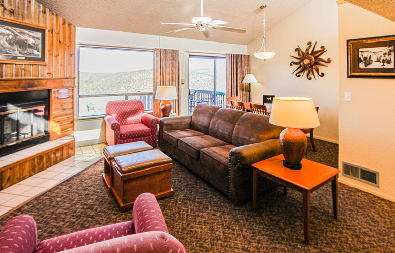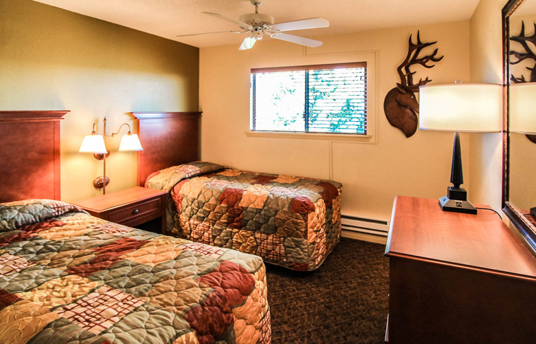 Our two bedroom deluxe units feature Village and Mountain views with a king size bed in the master bedroom and two twin beds in the guest bedroom. The unit includes a full kitchen, a queen sofa sleeper, master bathroom and full guest bathroom. This room type has an occupancy limit of 6 persons and sleeps 4 persons privately. These units feature single-level floor plans with no stairs inside and split-level floor plans which have several stairs within the unit. Accessible units in this type are limited and available upon request.