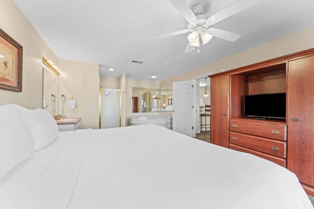 The standard 2 bedroom with balcony suite features two living rooms each with a pull out sleeper sofa, two bedrooms one with a king sized bed and jetted tub, the other with a queen sized bed. There are two washers and dryers, and 3 Bathrooms.