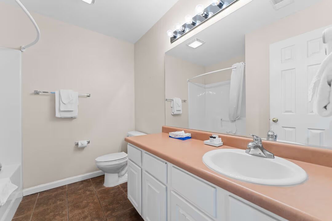 The standard one bedroom suite features a living room area complete with sleeper sofa, a fully furnished kitchen, dining area, one bathroom, and a bedroom with a queen sized bed.