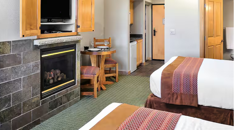This comfortable two-bedroom, two-bathroom suite features a fully equipped kitchen, two king-size beds, sleeper sofa and a fireplace. This suite also includes a deep soak tub in each bathroom.
