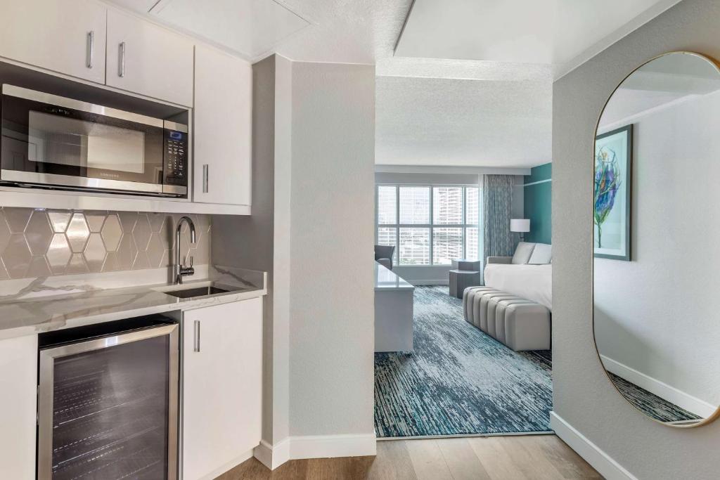 This spacious two-bedroom, two-bathroom suite features a primary bedroom with king-size bed and a bathroom with a free-standing shower and separate oversized tub. The second bedroom is furnished with a king-size bed, bathroom with a standard shower/tub combination, full-size sleeper sofa, and convenient kitchenette, and can be easily locked off from the main living area at the entry foyer to create a relaxing element of privacy. The suite also includes a full kitchen and a generous living room with separate dining area and queen-size sleeper sofa. Please note the 2 Bedroom suite layout consists of a 1 Bedroom suite and Studio sharing a common entry foyer.