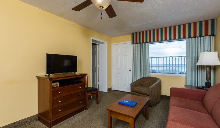 The one-bedroom units at Jade Tree Cove offer the same comfort and convenience of our studio apartments, along with added space for larger groups. With one queen bed and two queen-sized sleeper sofas, this unit type comfortably accommodates up to six guests. Cook and enjoy meals made in the unit’s fully-equipped kitchen, and experience the beautiful sights and charming sounds of Myrtle Beach from your private balcony overlooking the majestic Atlantic Ocean.