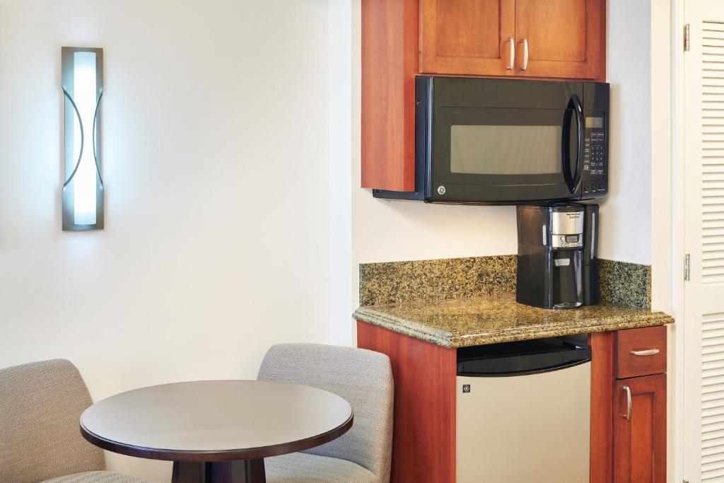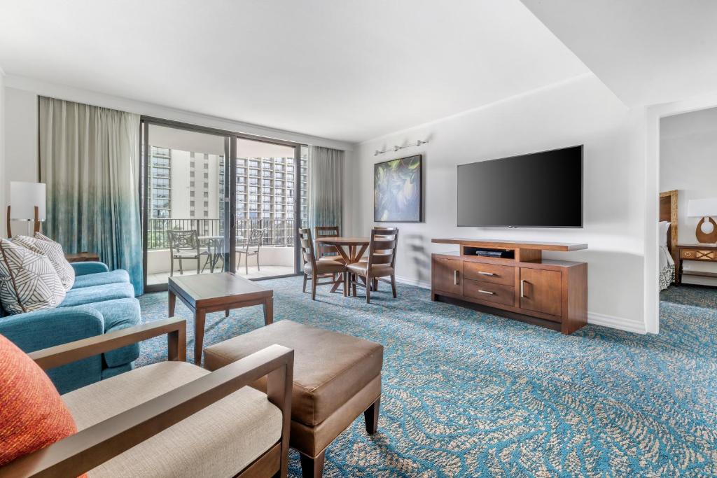 This spacious one-bedroom, one-bathroom city/mountain view suite with balcony lanai features a primary bedroom with king-size bed, 55-inch flat panel Smart TV featuring HGV’s In-Room TV Experience that allows content streaming from your mobile devices, and bathroom with a standard shower and TOTO washlet. The suite includes a generous living room with separate dining area, -inch flat panel Smart TV featuring HGV’s In-Room TV Experience that allows content streaming from your mobile devices and queen-size sleeper sofa, as well as a full kitchen with stove, oven, refrigerator, dishwasher, microwave, electric kettle, and rice cooker.