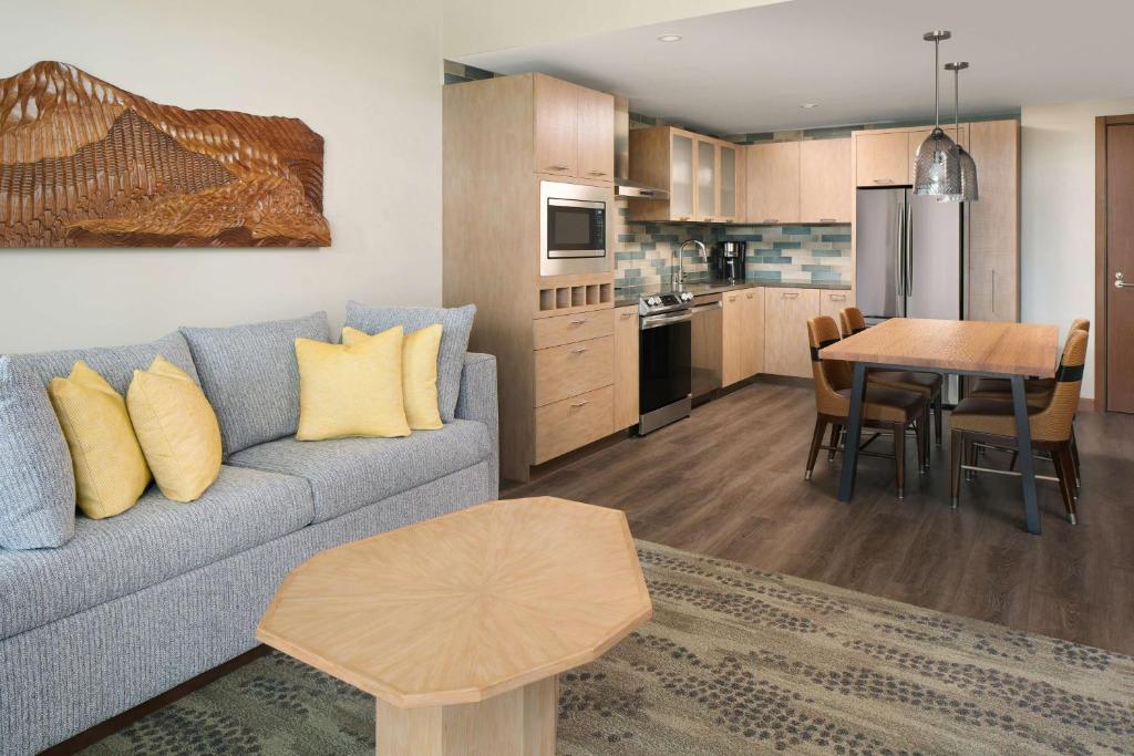 This one-bedroom, one-bathroom suite offers a 118 square-foot lanai area, as well as a balcony with seating for four. The primary bedroom features a king-size bed, 55-inch TV and a desk. The bathroom includes a vanity with a single sink, a backlit mirror, backlit make-up mirror and walk-in shower with a wall-mounted rain shower head. The toilet is in a separate room and has a washlet. The living room includes a sofa bed, 65-inch TV and dining table for four. The suite’s fully equipped kitchen features a sink with a waste disposer, dishwasher, full-size refrigerator with freezer and ice maker, electric range with oven, built-in microwave and washer/dryer unit.