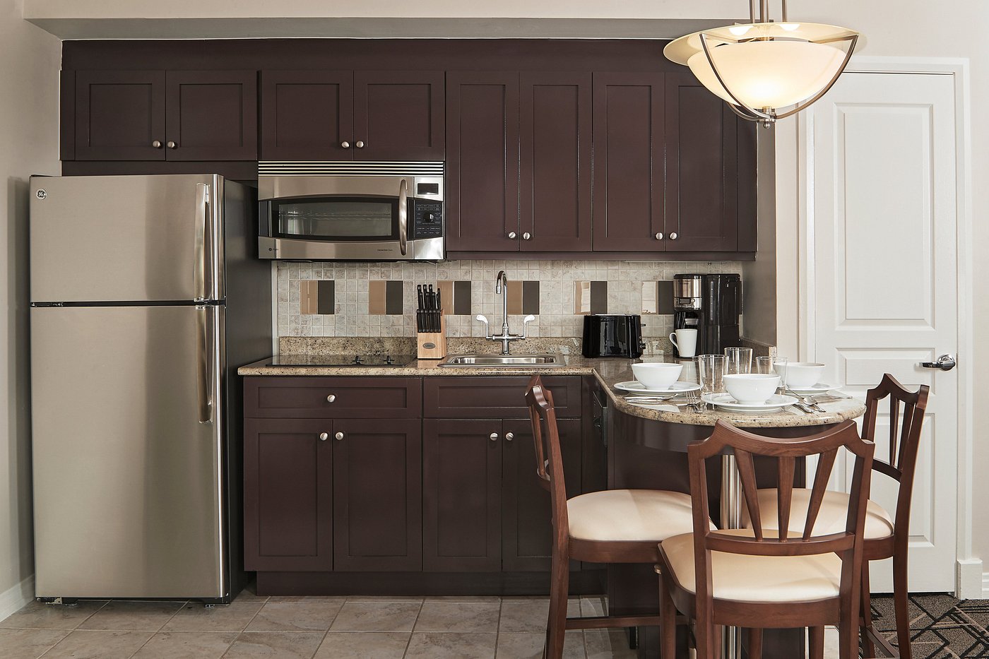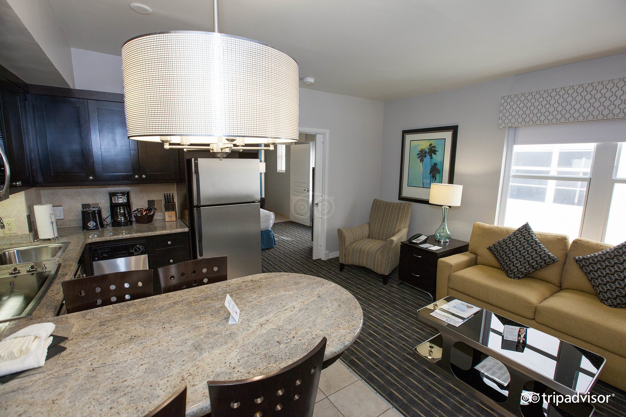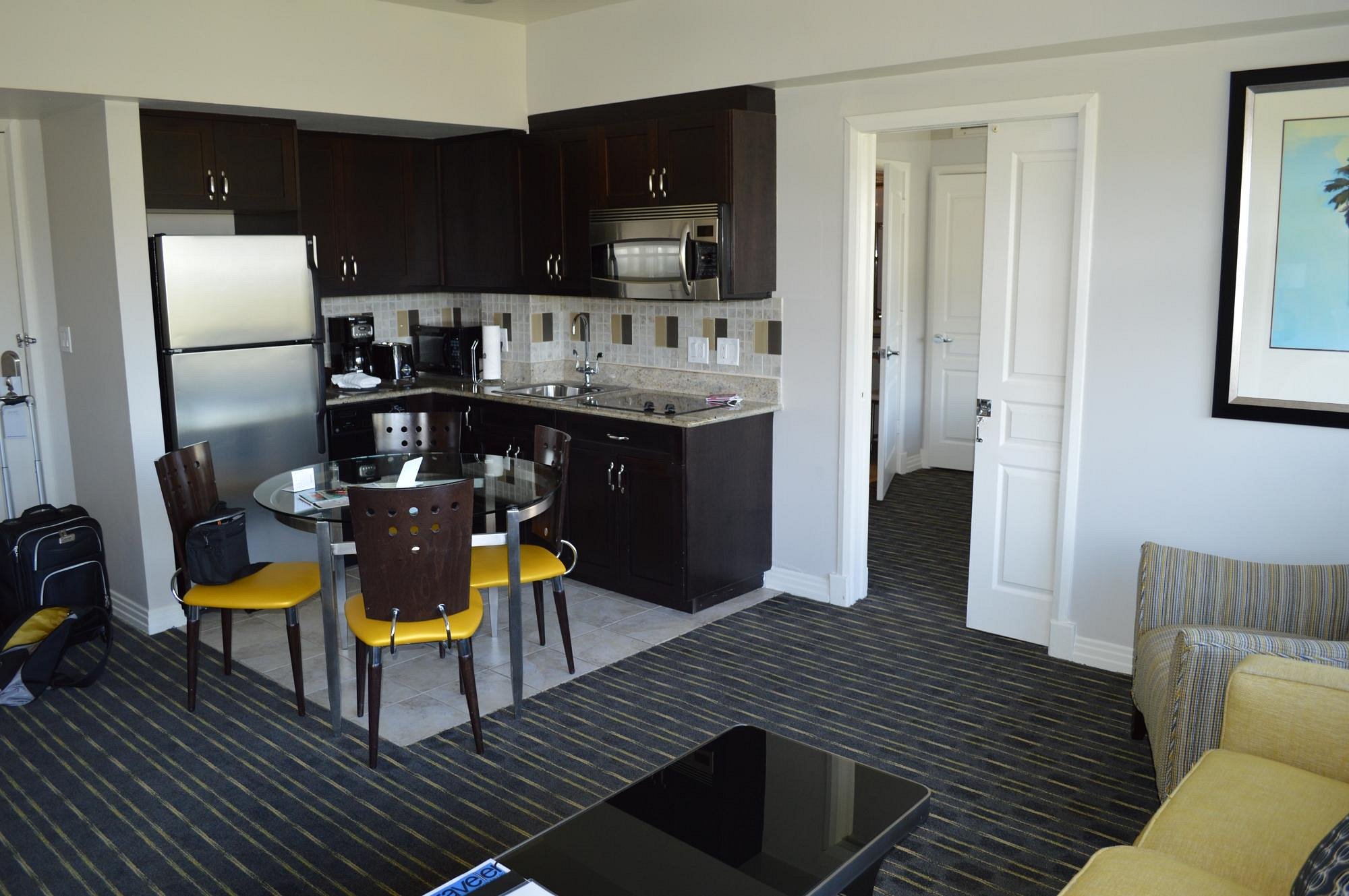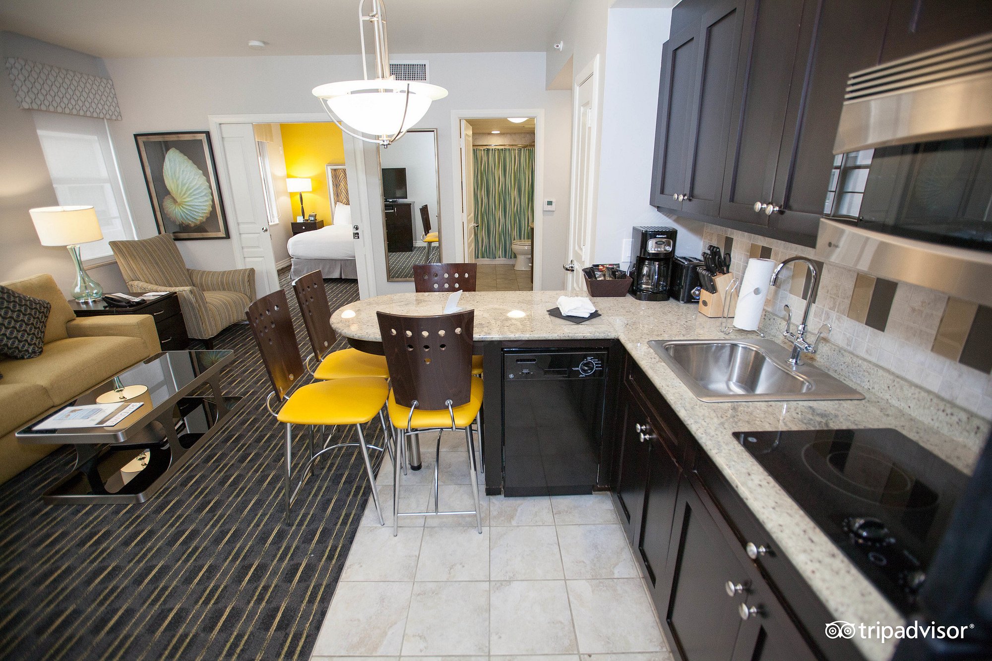 This spacious one-bedroom, one-bathroom suite features a primary bedroom with queen-size bed, bathroom with a standard shower and flat screen TV with cable. The suite includes a generous living room with dining area, flat screen TV with cable (DVD player available upon request; limited availability), and queen-size sleeper sofa, as well as a kitchen with convection microwave oven, coffee maker, toaster, and stovetop.