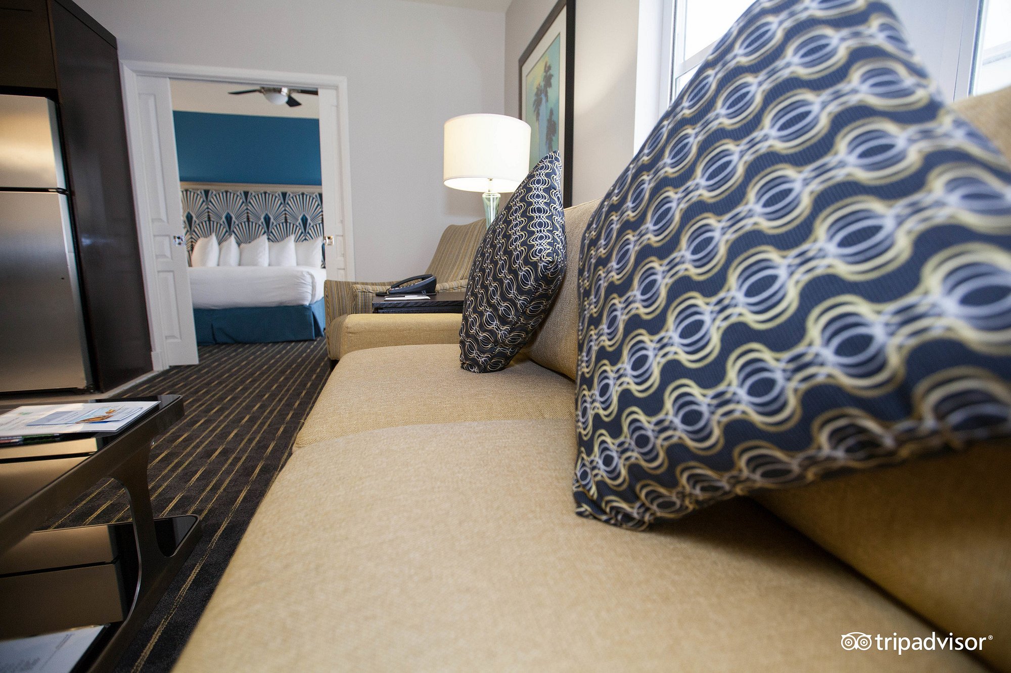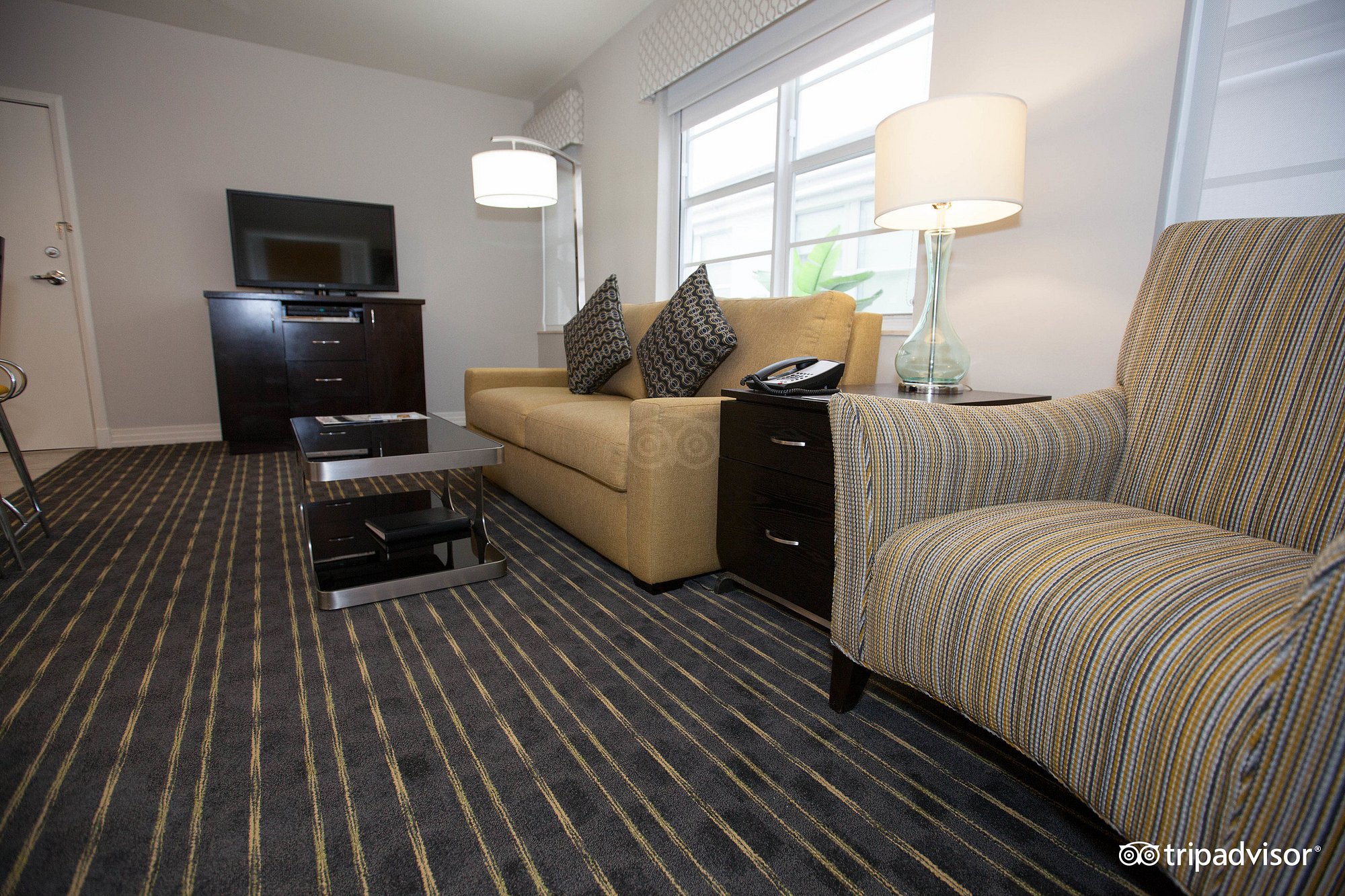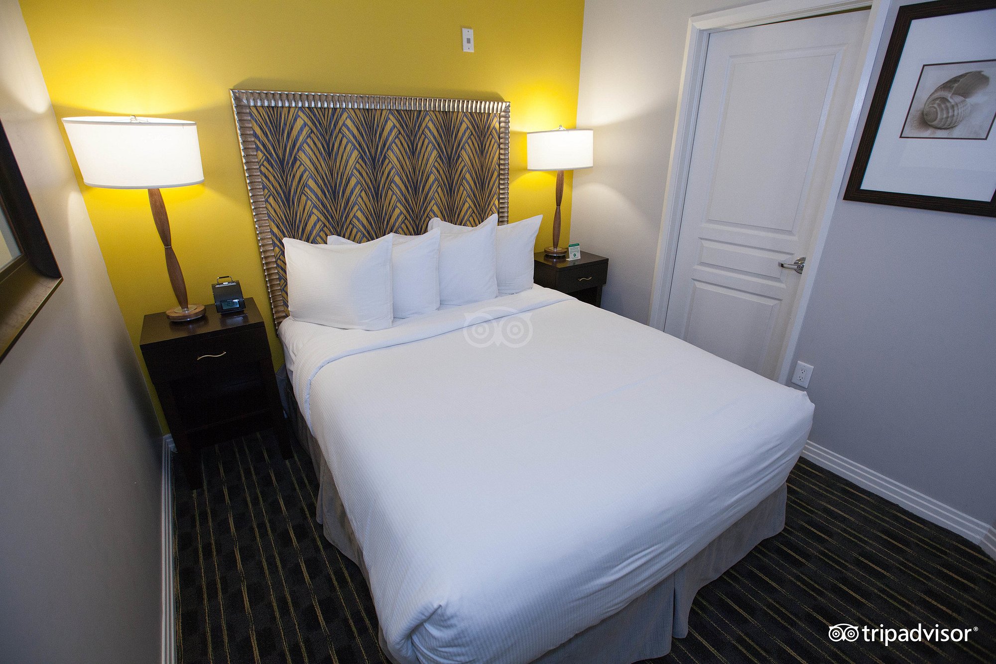 This spacious one-bedroom, one-bathroom suite features a primary bedroom with queen-size bed, bathroom with a standard shower and flat screen TV with cable. The suite includes a generous living room with dining area, flat screen TV with cable (DVD player available upon request; limited availability), and queen-size sleeper sofa, as well as a kitchen with convection microwave oven, coffee maker, toaster, and stovetop.