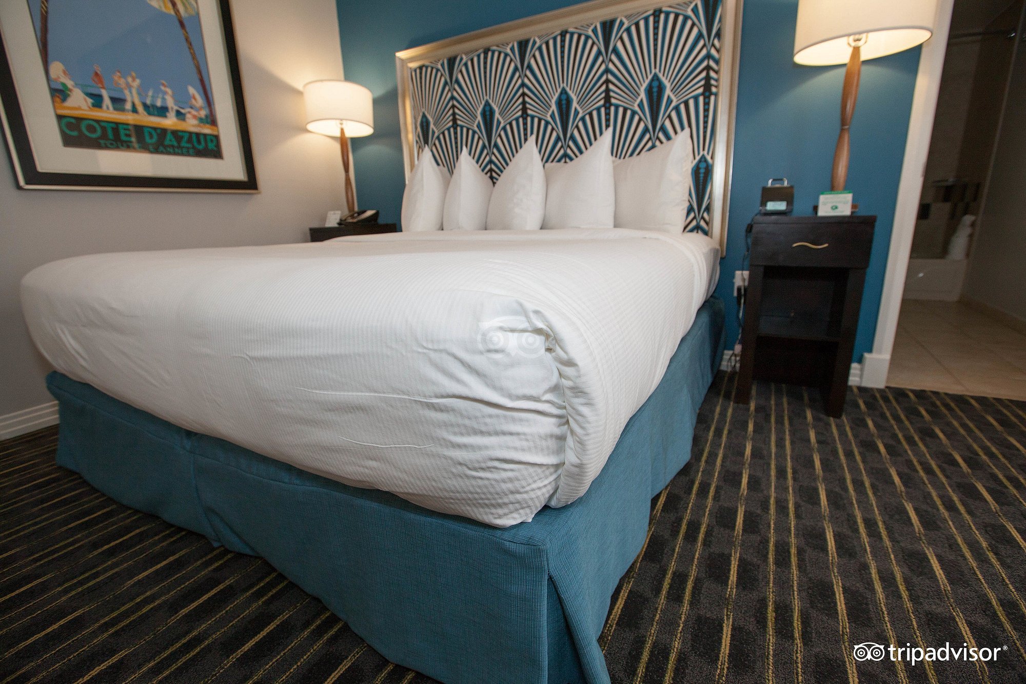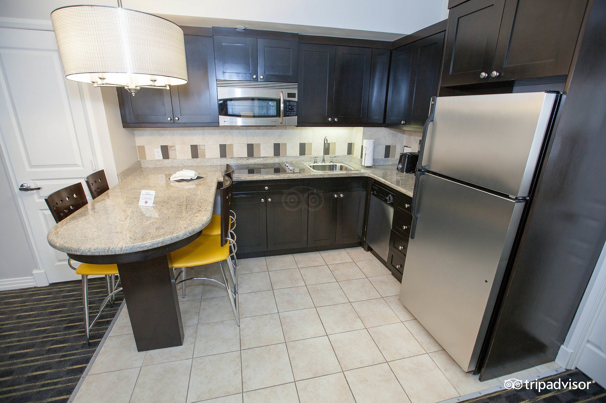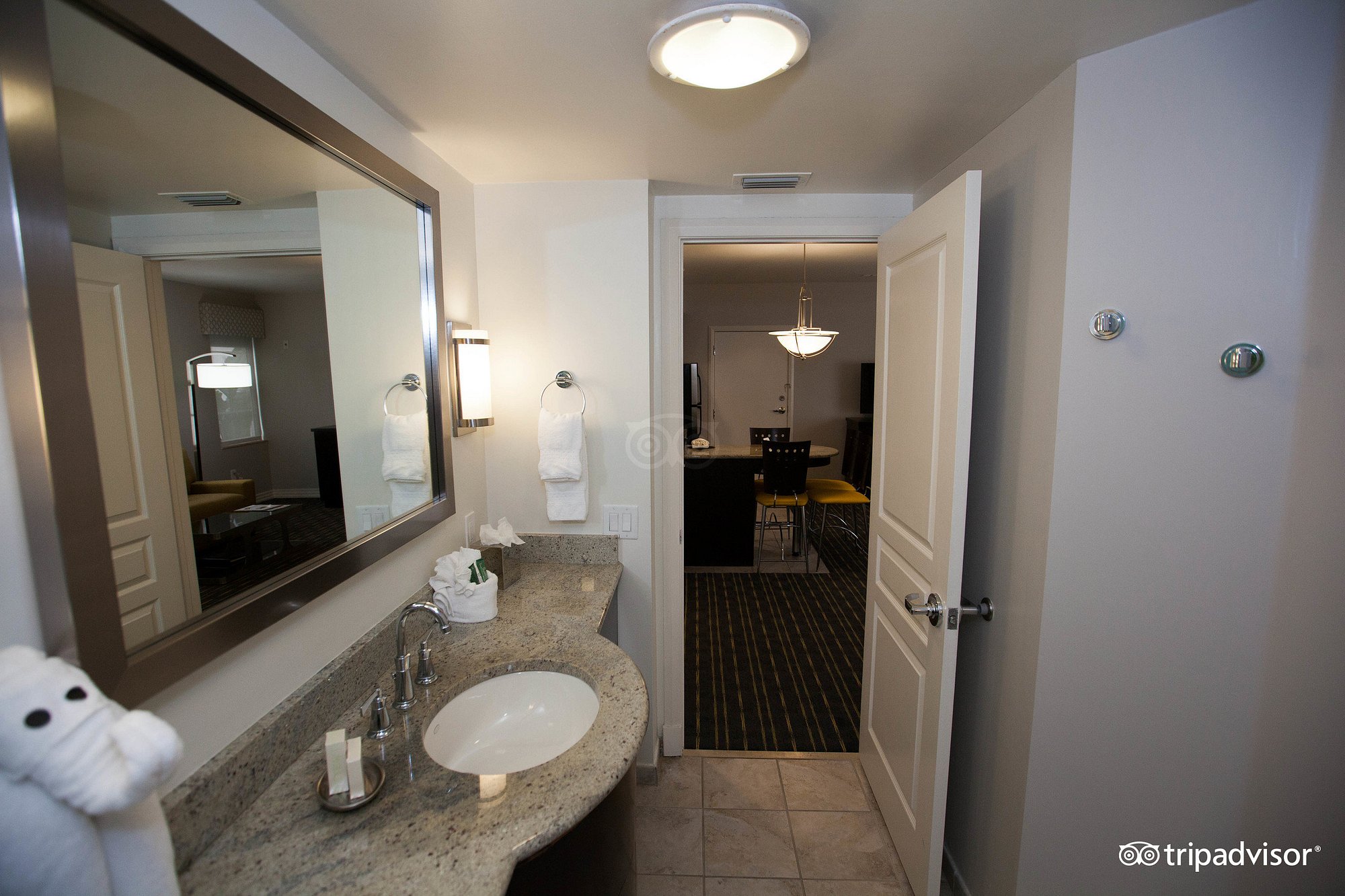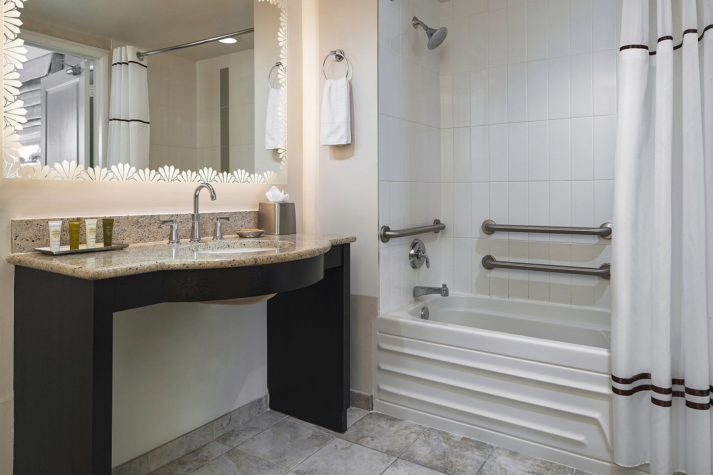 This spacious one-bedroom, one-bathroom suite features a primary bedroom with queen-size bed, bathroom with a standard shower and flat screen TV with cable. The suite includes a generous living room with dining area, flat screen TV with cable (DVD player available upon request; limited availability), and queen-size sleeper sofa, as well as a kitchen with convection microwave oven, coffee maker, toaster, and stovetop.