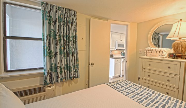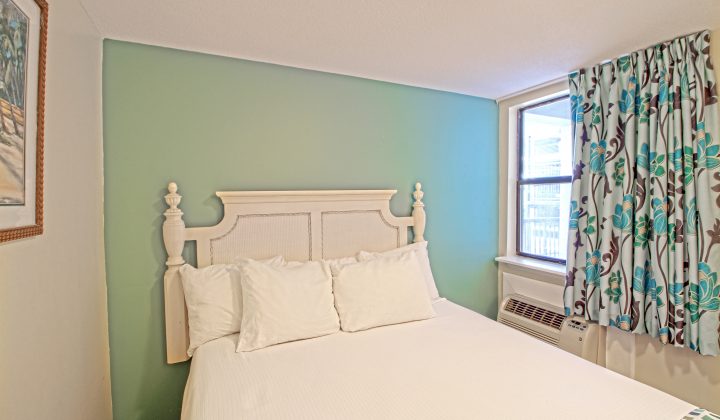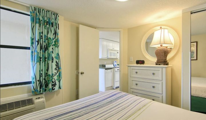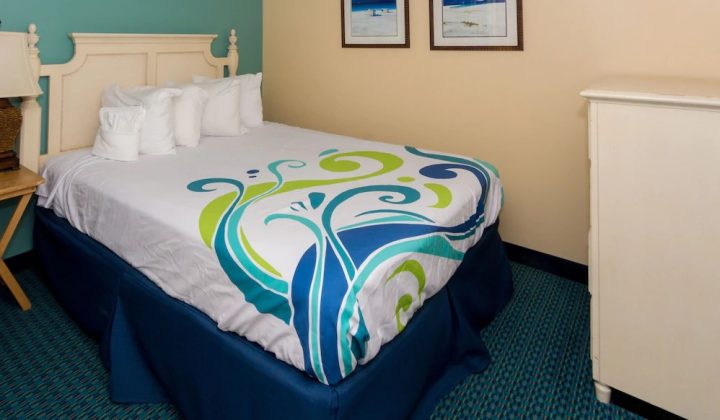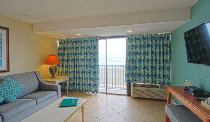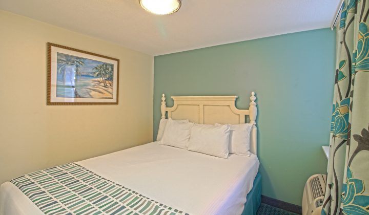 One-bedroom suites feature one queen bed in the bedroom, one queen sleeper sofa or bunk beds in an alcove, and one full bathroom. All one-bedroom units include fully-equipped kitchens with major appliances and can accommodate up to four guests. Select rooms offer private balconies and ocean views.