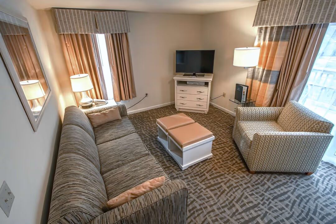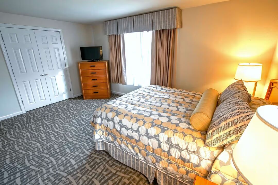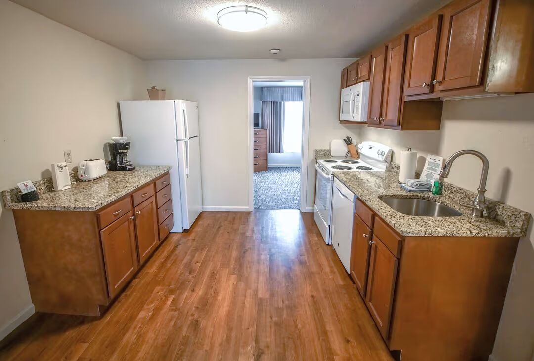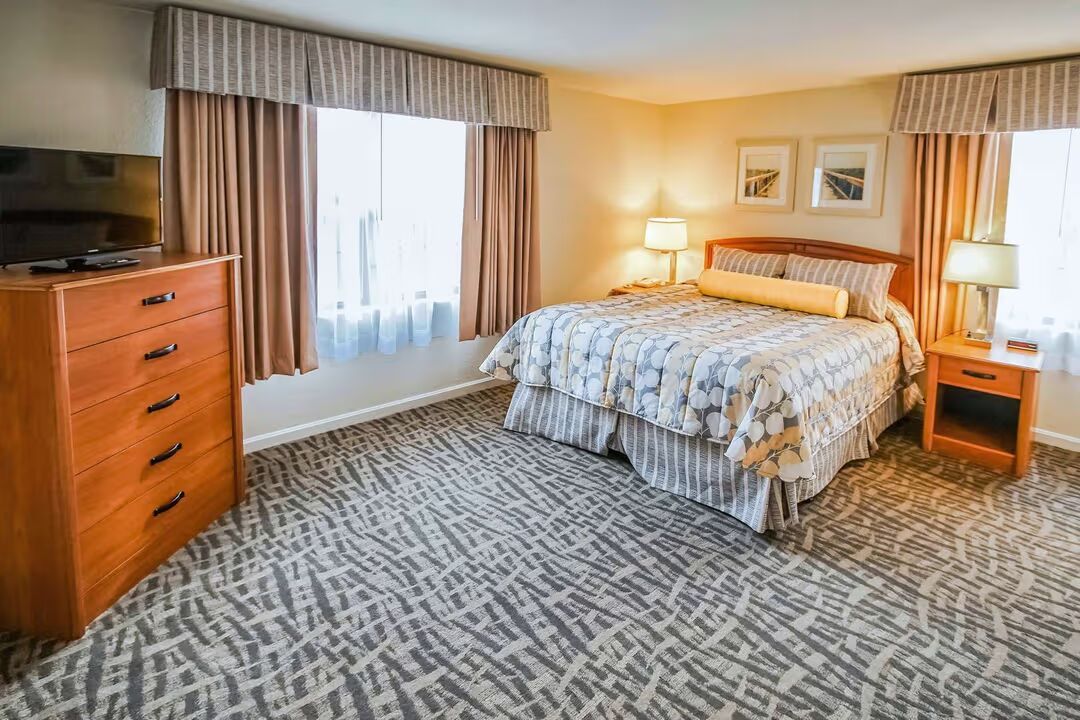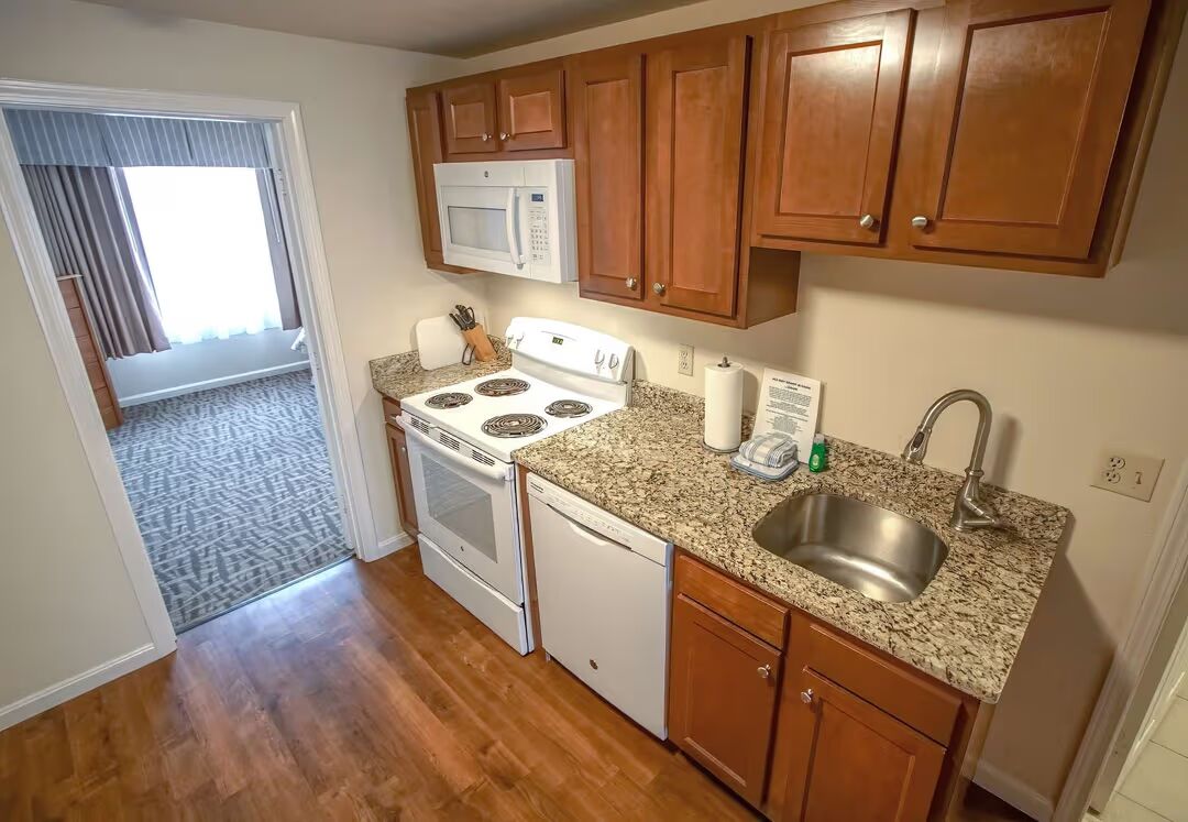 Our 1 Bedroom Suite is designed for comfort and convenience, offering 660 sq. ft. of airy living space. Perfect for couples or small families, the suite features a queen bed in the private bedroom and a double sofa sleeper in the living room, comfortably accommodating up to 4 guests. The full kitchen makes mealtime easy, with a refrigerator, stove, microwave, and all the essentials for cooking at home. Step outside onto your private patio, stay connected with complimentary Wi-Fi, and enjoy the flexibility of having both resort amenities and the comforts of home under one roof.