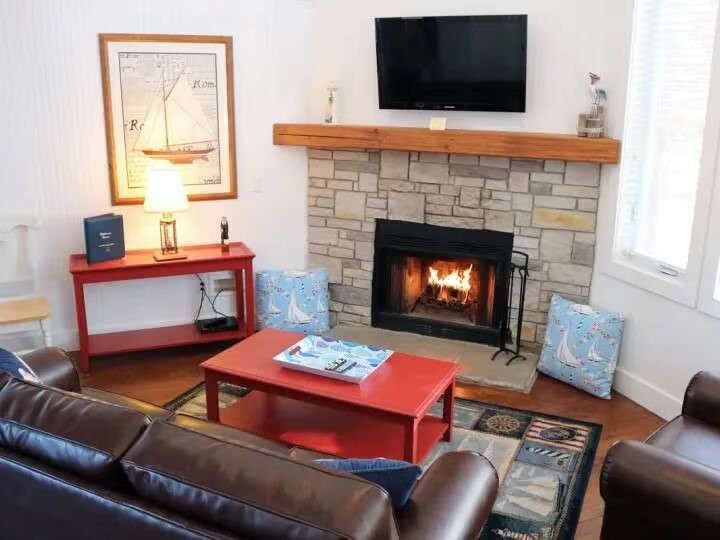 – Living Area: Spacious living room with sofa seating, flat-screen TV, and a cozy fireplace — perfect for gathering after a day in Branson.