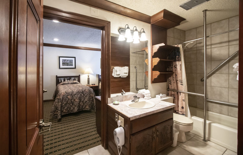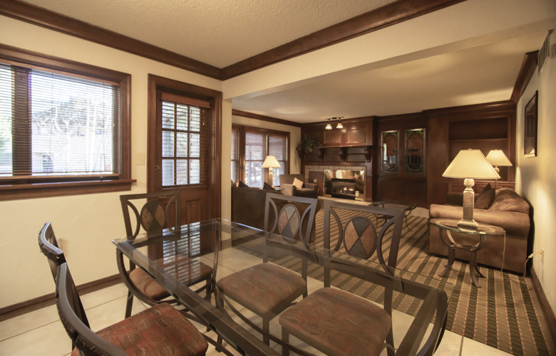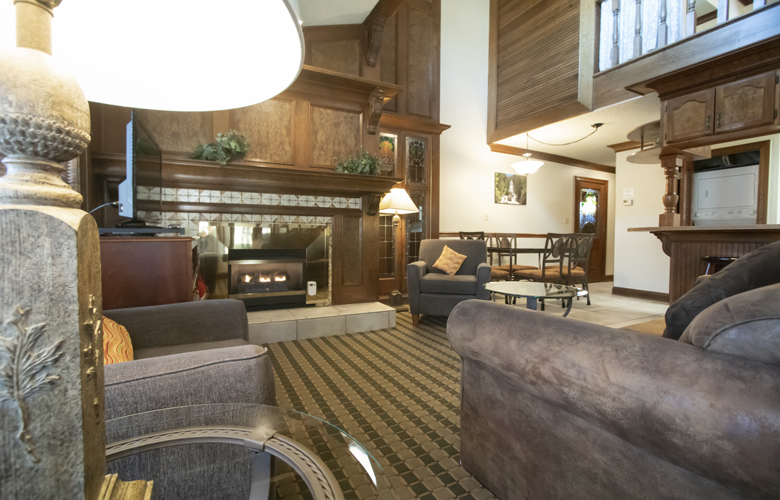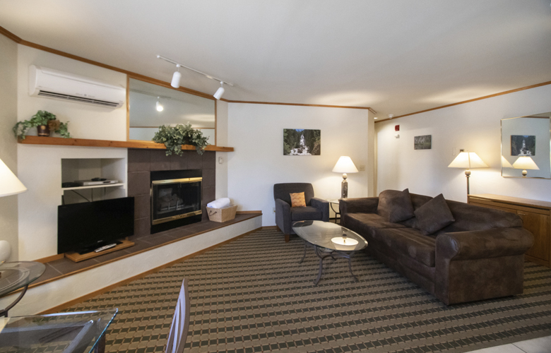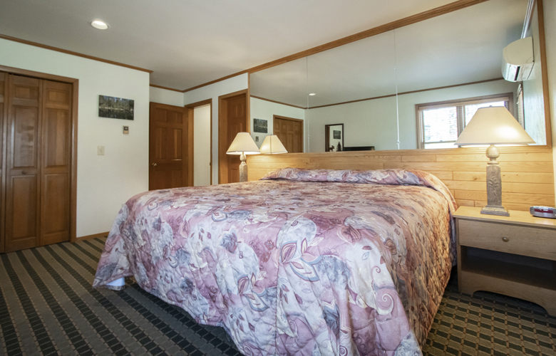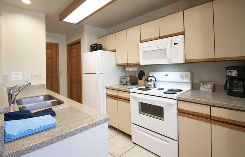 A one-bedroom unit features a king or queen size bed in the bedroom. The unit includes a full kitchen, washer & dryer, and one bathroom. This room has a maximum occupancy of 4 and sleeps 2 privately.