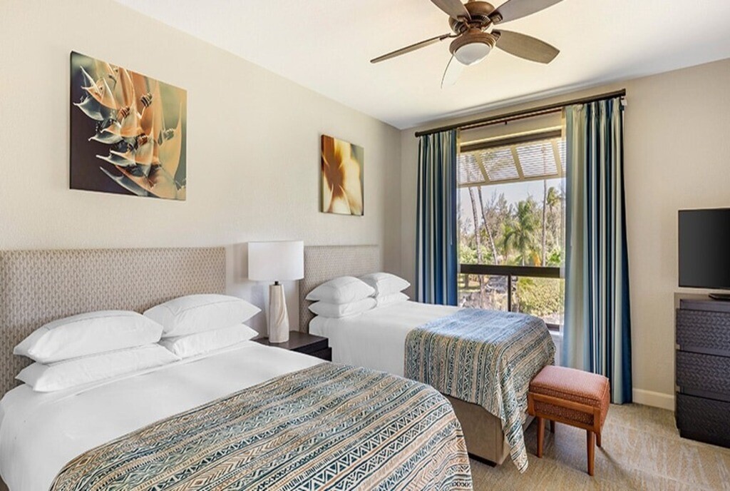 Spacious 2-bedroom/2- or 2.5-bathroom suites with a lanai feature a large primary bedroom with a king-size bed and bathroom with a free-standing shower and separate tub or standard shower/tub combination. The second bedroom is furnished with two double or a queen-size bed and includes a bathroom with a standard shower/tub combination. The suite also offers a generous living room with cable TV and a queen-size sleeper sofa, as well as a fully equipped kitchen, and washer/dryer.
