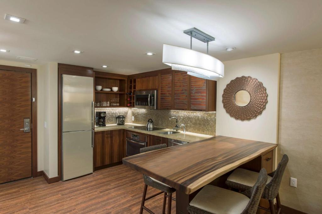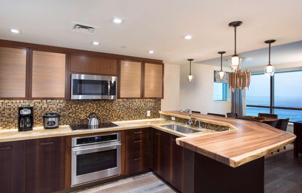 This one-bedroom, one-bathroom resort view suite with lanai features a primary bedroom with two double beds, 50 55-inch flat-panel HD Smart TV and spa-like bathroom with a sleek shower, a deep soaking bathtub, private water closet with TOTO washlet and elegant vanity area. The suite includes a generous living room with dining area, 65-inch flat-panel Smart TV featuring HGV’s In-Room TV Experience that allows content streaming from your mobile devices, and queen-size sleeper sofa, as well as a fully equipped kitchen with stove, oven, refrigerator, instant hot water dispenser, dishwasher, electric kettle, rice cooker, and microwave and washer/dryer.