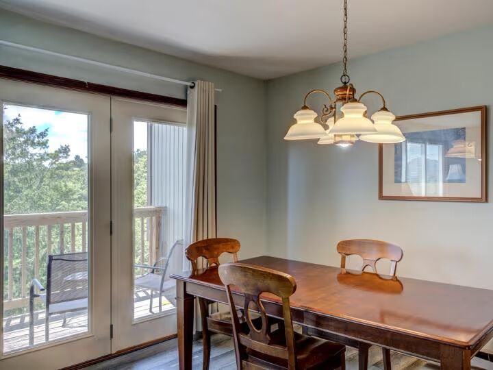 Comfortable living space highlighted by a wood-burning fireplace, creating a warm and inviting atmosphere. Large windows bring in natural light and frame the mountain scenery, while the adjacent dining area offers space for shared meals.