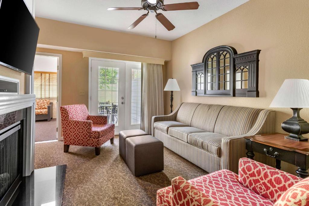 1,230 sq. ft. – 340 units – Full Kitchen – Max Occupancy: 6. Bedding: One King, One Queen, and One Queen Sleeper Sofa. Our 1,230 sq. ft., two-bedroom accommodations exude relaxation and create the perfect haven amid the thrills and adventure of Williamsburg. Families will enjoy the additional privacy of two separate bedrooms and two full baths. For larger families, the living room features a sleeper sofa. Leave your worries behind and luxuriate in the spacious comfort of your home away from home. Relax with a hot cup of freshly brewed coffee each morning, or have a glass of wine to unwind from the day. Create more memories around the dinner table and gather the family to enjoy your favorite meals from the comfort of a well-appointed kitchen featuring a refrigerator, microwave, oven, stove and a coffee maker.