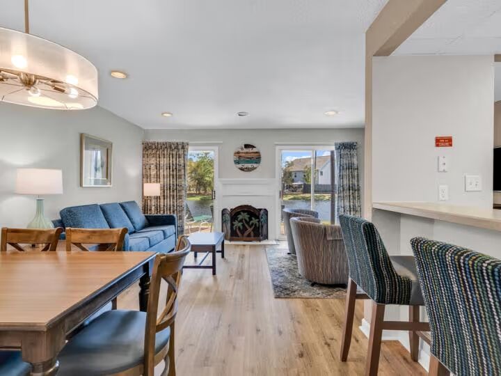 The fully equipped kitchen is stocked with all your culinary essentials, stainless steel appliances, and plenty of counter space—plus bar seating for casual bites. Whether you’re whipping up breakfast before a beach day or enjoying dinner after a round of golf, this kitchen makes cooking a breeze.