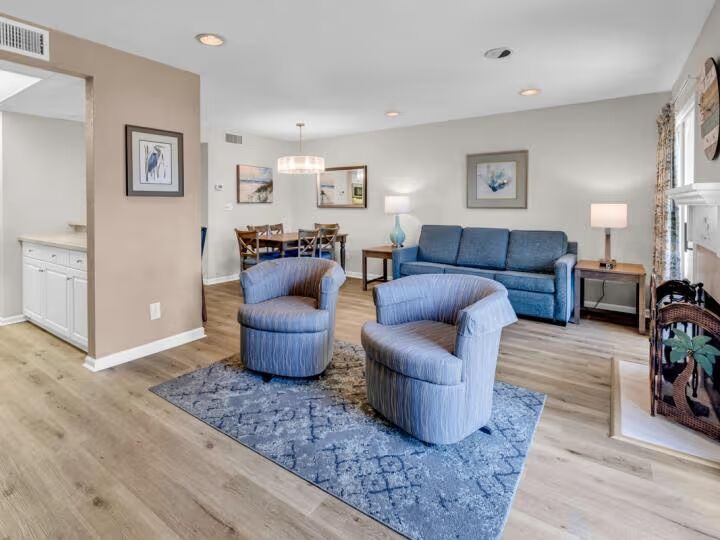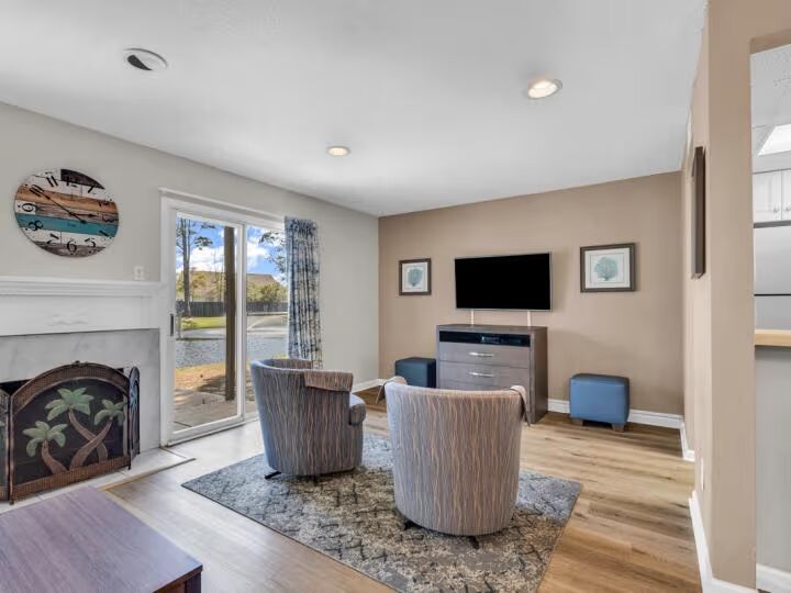 Kick back and relax in the spacious living room featuring a large flat-screen TV and a cozy fireplace for those cooler coastal evenings. The open-concept layout flows seamlessly into the dining and kitchen areas, creating a perfect hub for relaxing and socializing.