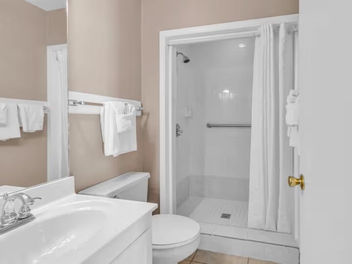 Also located on the second floor, the guest bedroom is bright and welcoming with two twin-sized beds and its own flat-screen TV. This room includes an ensuite bathroom with a tub/shower combo and a single vanity—perfect for kids, friends, or additional guests.