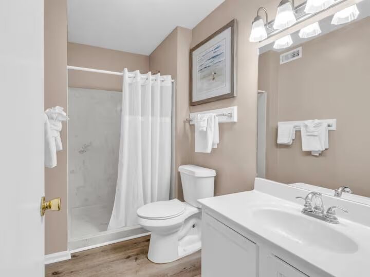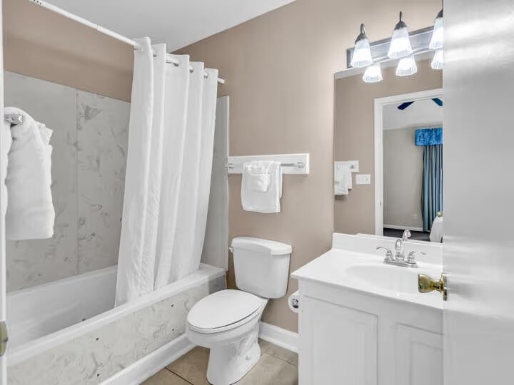 This townhome includes a full-size washer and dryer located upstairs for your convenience. High-speed Wi-Fi and TVs in every room ensure guests stay connected and entertained throughout their stay. Guests also enjoy access to The Links Golf & Racquet Club amenities, including a clubhouse, tennis courts, pool, fitness center, and shuttle service to the beach.