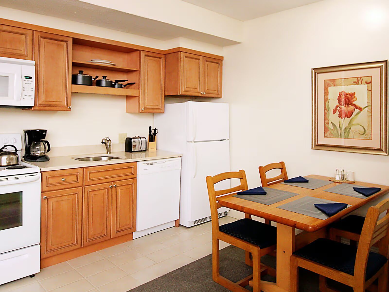 A fully equipped kitchen with modern appliances, cookware, and place settings, plus a dedicated bar area for mixing evening drinks or serving appetizers.