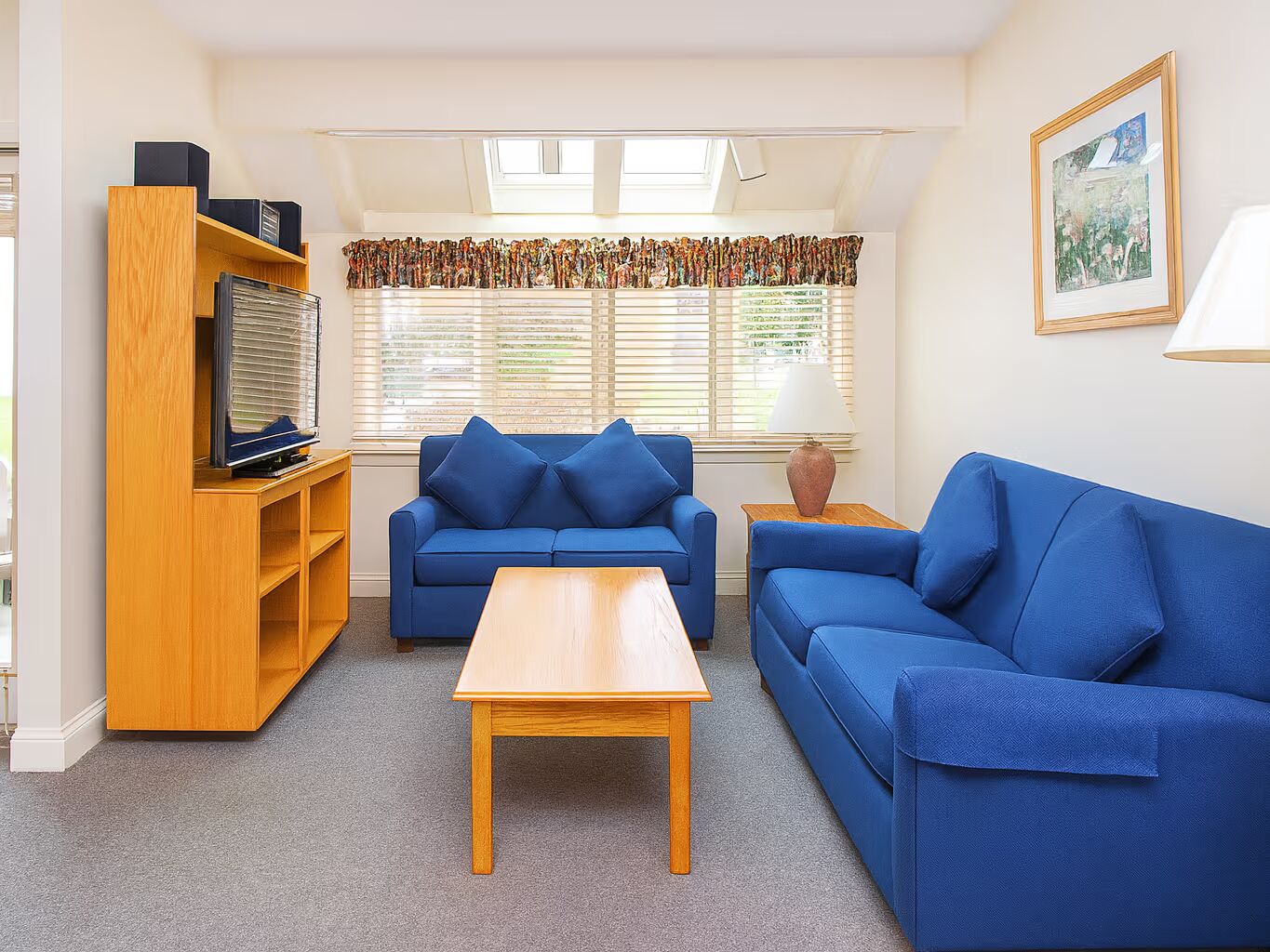 Spacious and welcoming, the living area includes a comfortable sofa, armchair, fireplace, and television. The dining area has seating for four, perfect for shared meals.