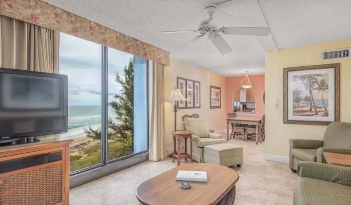 Relax in the comfort one of our 2-bedroom, 2-bathroom units, featuring oceanfront views from your own private, screened balcony and all the amenities you need for a fun-filled beach getaway. Each unit is equipped with a fully-furnished kitchen, allowing you to cook your favorite meals and enjoy them in the dining room or on the balcony with the beautiful Treasure Coast as a backdrop. Guests will enjoy relaxing in the spacious living room after a long day at the beach or pool. Rooms contain one king bed in the first bedroom and two twin beds in the second room. Expand your sleeping arrangements by making use of the living room’s queen sleeper sofa. This unit type is ideal for small to mid-size groups.