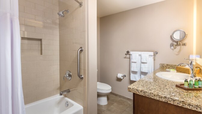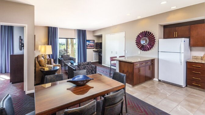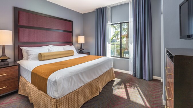 This spacious three-bedroom resort suite measures approximately 1,199 square feet. You will enjoy a king bed in the master bedroom, a queen bed in the guest bedroom, two twin beds in the third bedroom and a Murphy bed in the living room. Additional amenities include a full kitchen, two bathrooms, and a patio or balcony. Maximum occupancy is eight. Private sleeping area sleeps six.