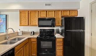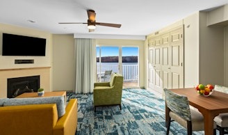 WorldMark Lake of the Ozarks, located at Osage Beach, blends modern comforts with old-fashioned country pleasures. Besides a wonderful lake view from every suite and pleasing on-site amenities, this resort also assures you convenient access to many of the most popular Ozark area attractions, from lake and cavern adventures to shopping, amusement and water parks, plus more. This spacious one-bedroom measures approximately 717 square feet. You will enjoy a king bed in the master bedroom and one queen Murphy bed in the living room. Additional amenities include a full kitchen and dining table, gas fireplace, washer/dryer, and a private deck . Maximum occupancy is four. Private sleeping area sleeps two.