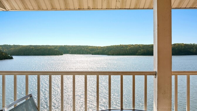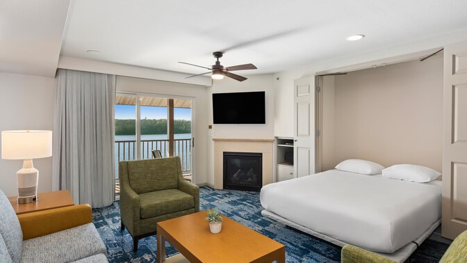 WorldMark Lake of the Ozarks, located at Osage Beach, blends modern comforts with old-fashioned country pleasures. Besides a wonderful lake view from every suite and pleasing on-site amenities, this resort also assures you convenient access to many of the most popular Ozark area attractions, from lake and cavern adventures to shopping, amusement and water parks, plus more. This spacious two-bedroom measures approximately 1,036 square feet. You will enjoy a king bed in the master bedroom two twins in the second bedroom and one queen Murphy bed in the living room. Additional amenities include a full kitchen and dining table, gas fireplace, washer/dryer, and a private deck. Maximum occupancy is six. Private sleeping area sleeps four.