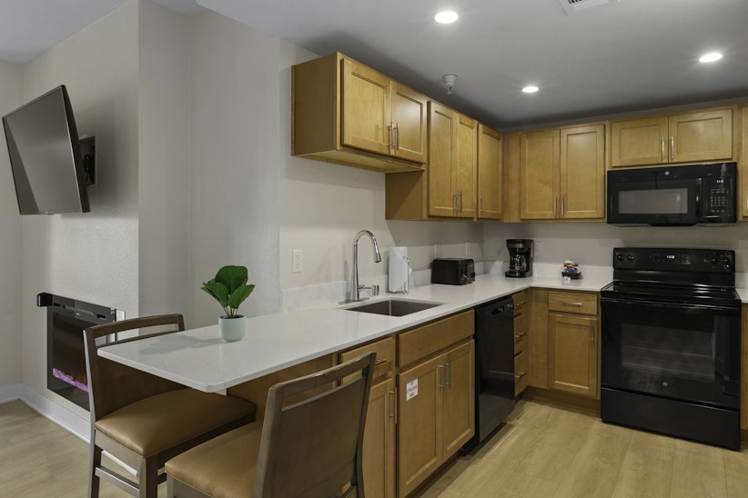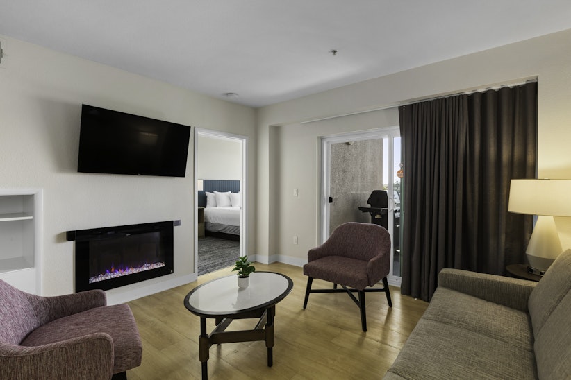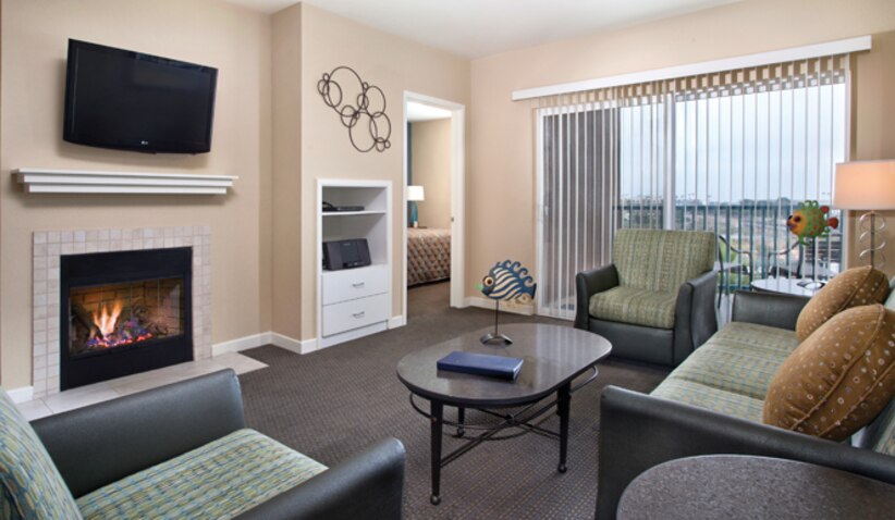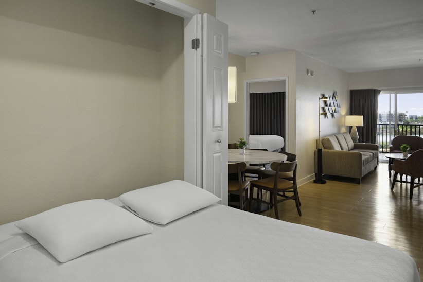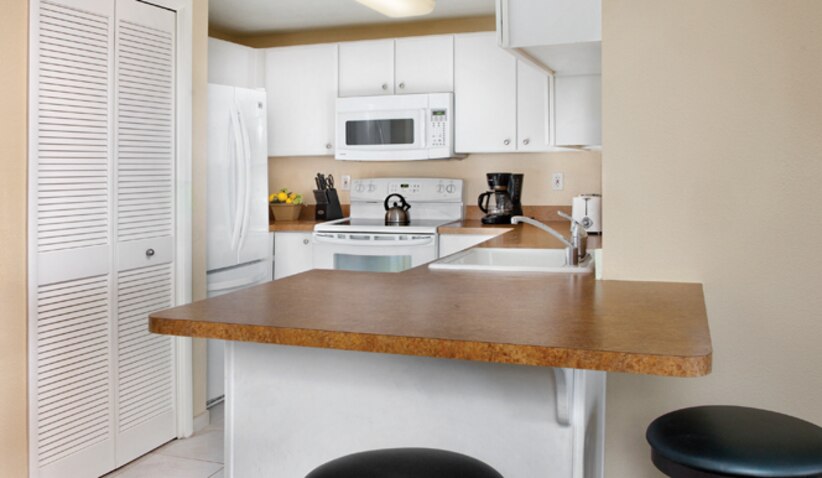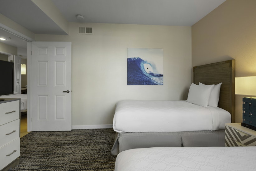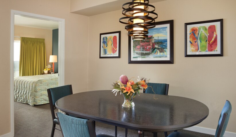 This spacious three-bedroom resort suite measures approximately 1,305 square feet. You will enjoy a king bed in the master bedroom, one queen bed in the second bedroom, two twin beds in the third bedroom and one queen Murphy bed in the living room. Additional amenities include a full kitchen and dining area. Maximum occupancy is eight. Private sleeping area sleeps six.