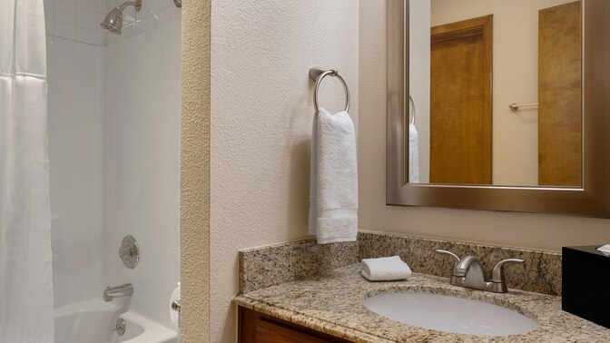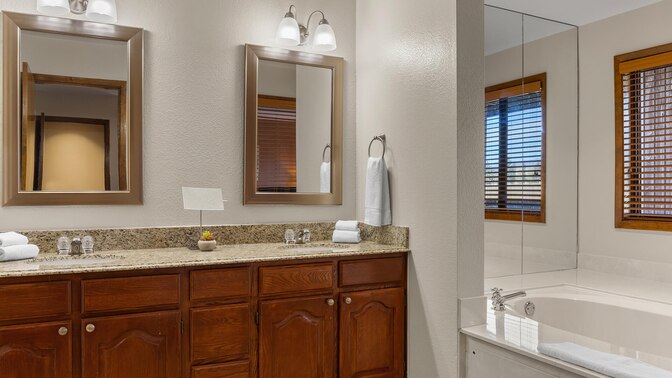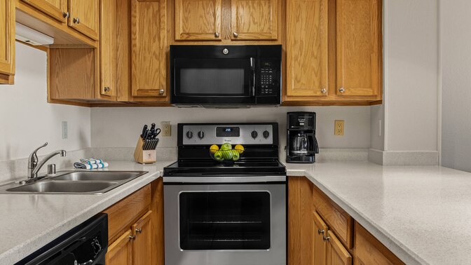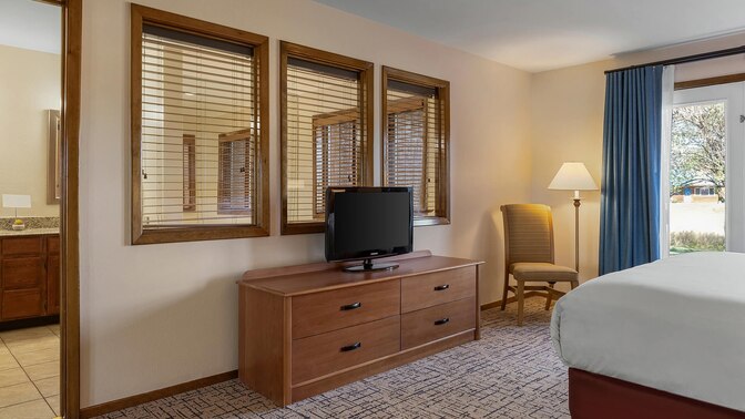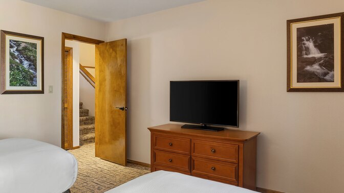 This spacious two-bedroom resort suite measures approximately 1,166 square feet. You will enjoy one king bed in the master bedroom and two full beds in the guest room. Additional amenities include a full kitchen and dining area, two bathrooms and a washer/dryer. Maximum occupancy is six.