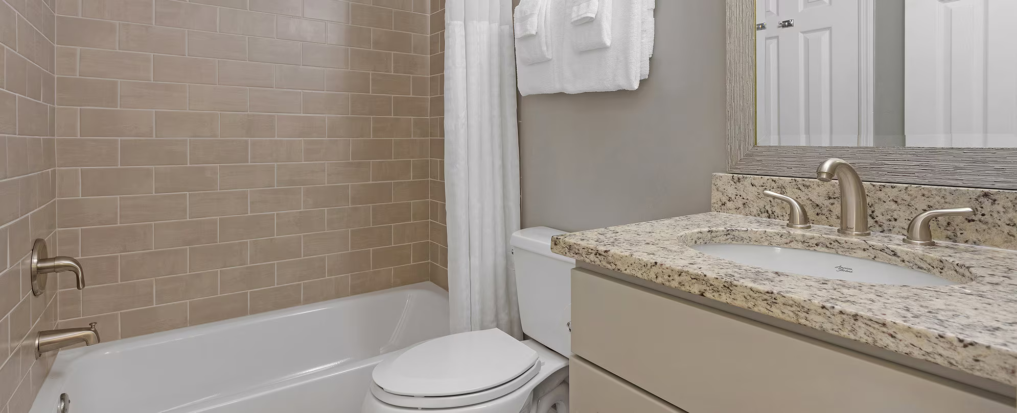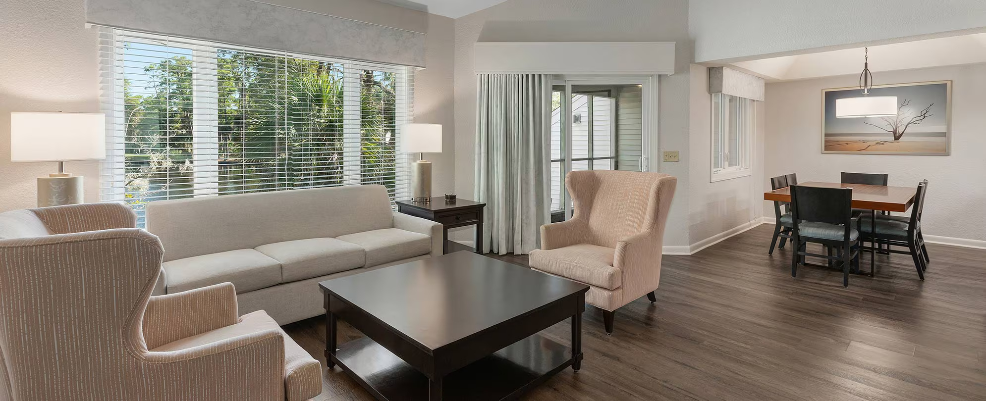This well-designed suite offers 673 to 711 sq. ft. of comfortable living space and is ideal for up to four guests. It features a full kitchen and one bathroom, making it suitable for both short and extended stays. The sleeping arrangement includes one king bed and a queen sleeper sofa, providing flexibility and comfort. A private balcony or patio creates a relaxing outdoor space, while in-unit amenities ensure a convenient and enjoyable stay.