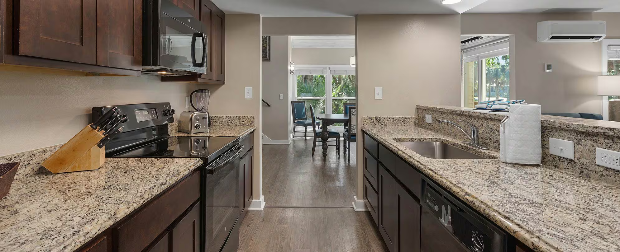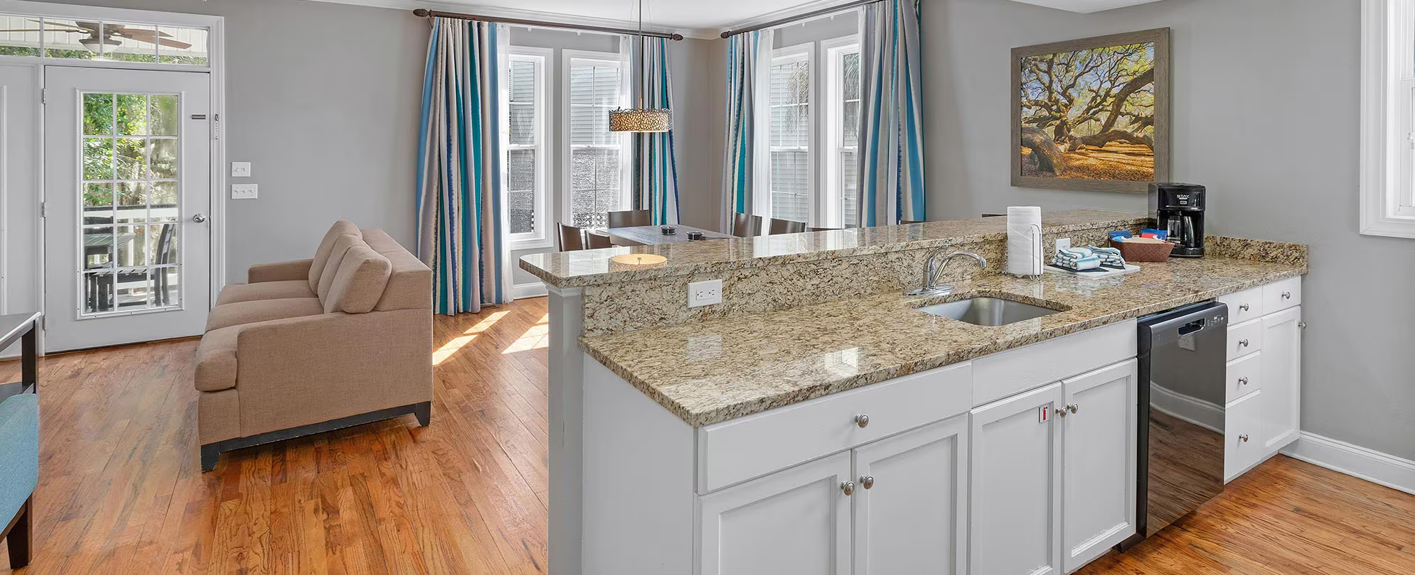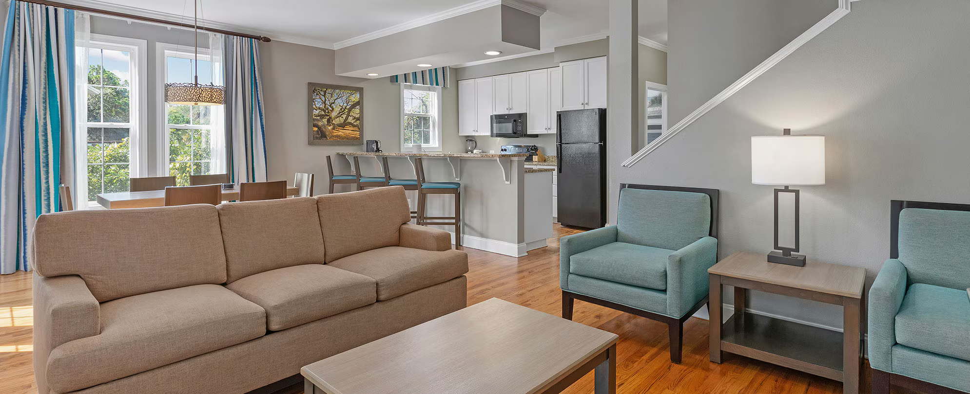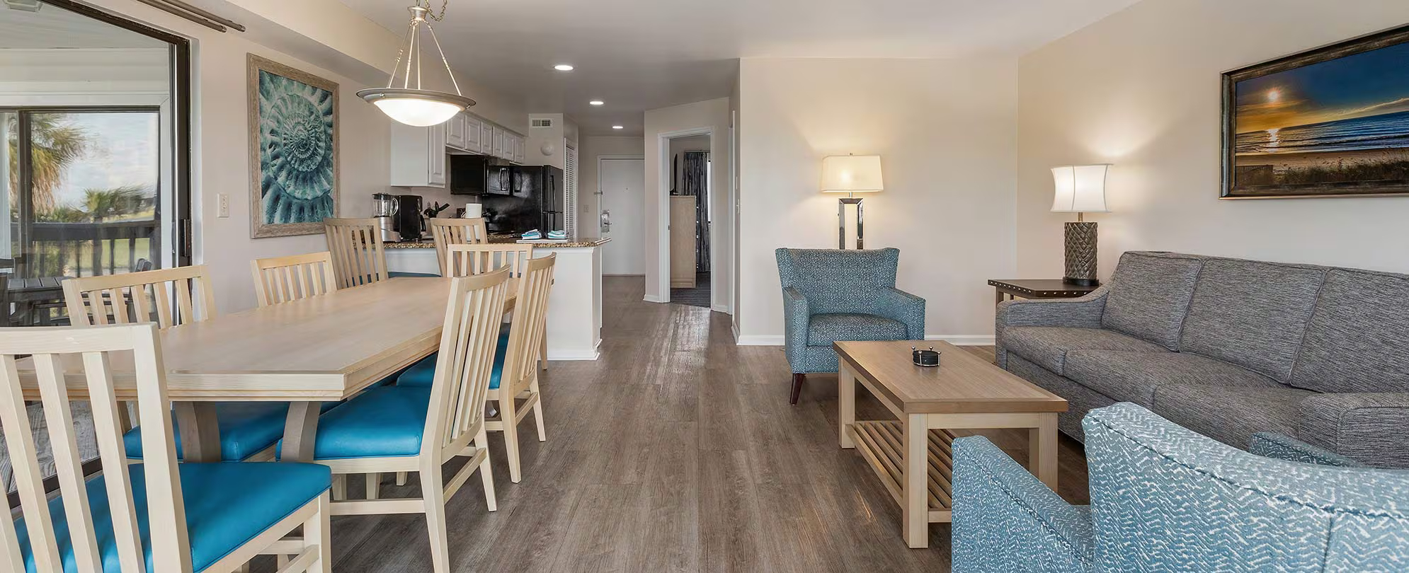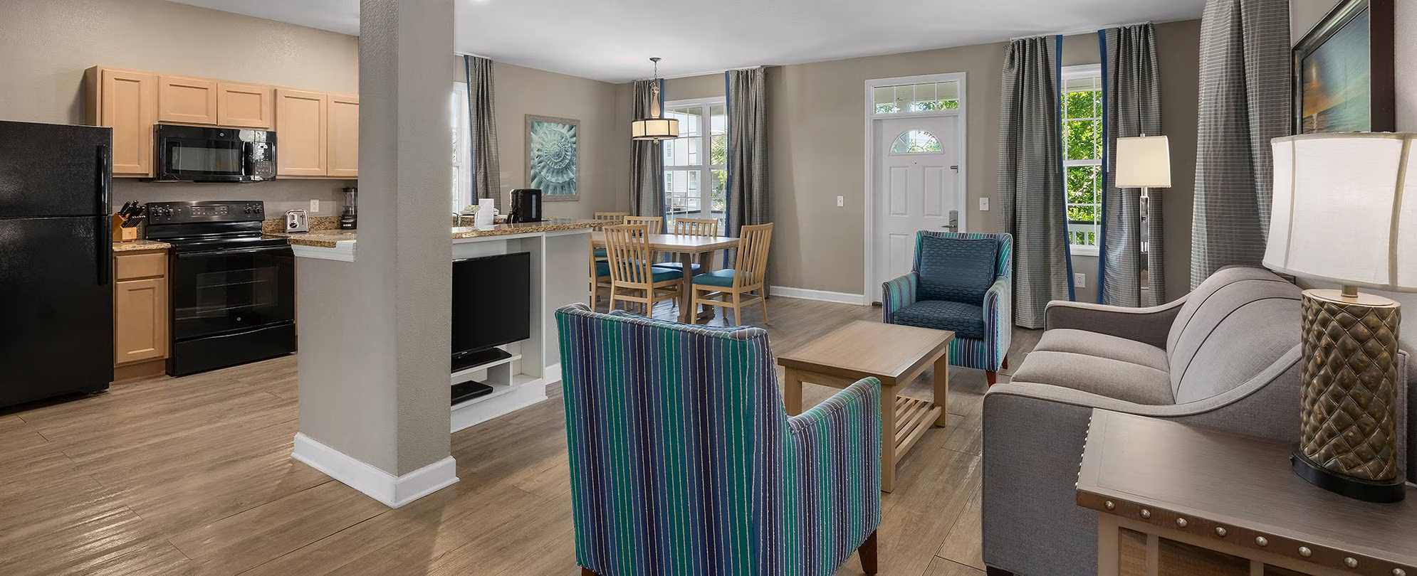 This spacious suite offers 960 sq. ft. of well-planned living space and comfortably accommodates up to six guests. It features a full kitchen and two bathrooms, providing added convenience and privacy. The sleeping arrangement includes one king bed, two twin beds, and a queen sleeper sofa, making it ideal for families or small groups. A private balcony or patio offers a relaxing outdoor area, while modern in-unit amenities ensure a comfortable and enjoyable stay.